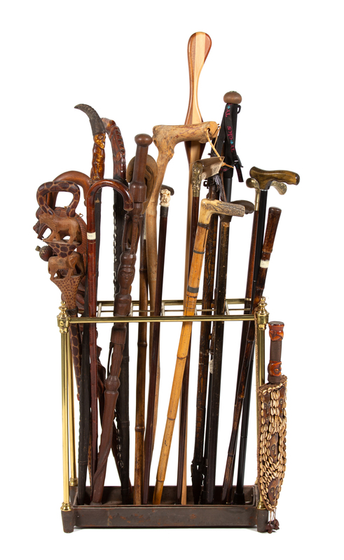 A Collection of Nine Miscellaneous Walking Sticks in a Brass Umbrella Stand