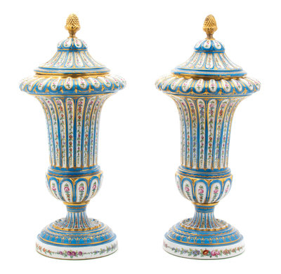 A Pair of Sevres Style Porcelain Polychrome and Gilt Decorated Covered Urns