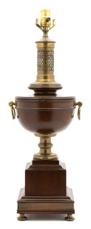 A Regency Style Brass-Mounted Treen and Tole Urn-Form Lamp