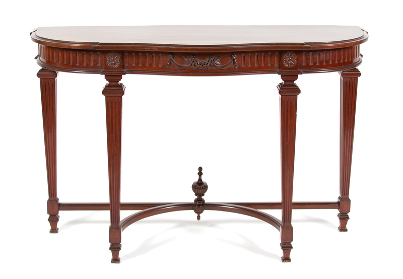 having a molded edge top over fluted frieze, raised on tapered fluted legs connected by a shaped stretcher with urn finial.