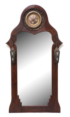 An Art Deco Style Stained Oak and Wrought Iron Mounted Hall Mirror