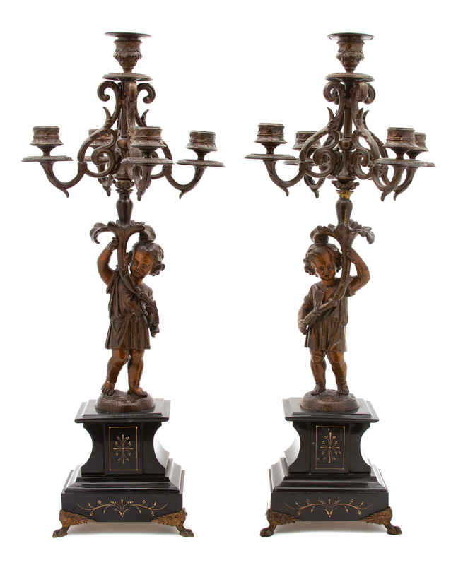 A Pair of Victorian Patinated Metal and Black Marble Five Light Candelabra