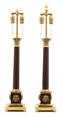 A Pair of Neoclassical Style Columnar Brass and Tole Lamps