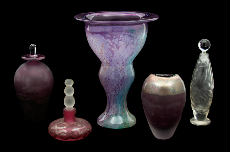 comprising three scent bottles, an ovoid form vase and a tall lobed vase.
