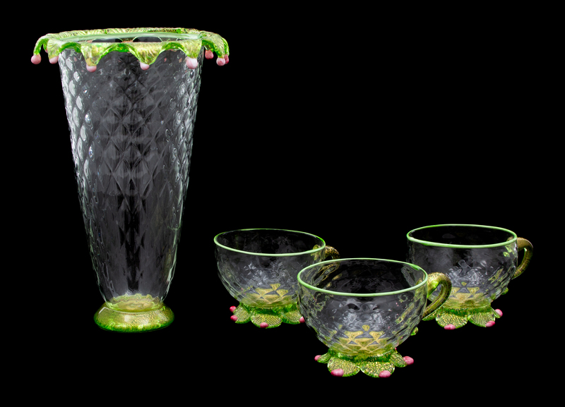 comprising a vase and three cups, all with enameled and quilted design in green with gilt and pink accents.