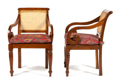 having caned seat and back, with paisley upholstered loose seat cushions.