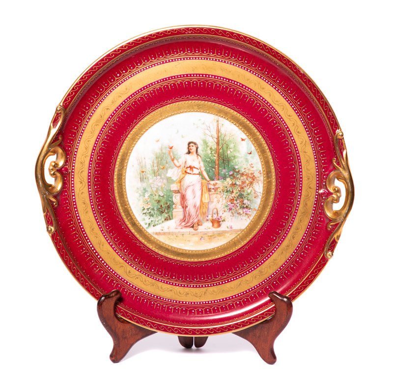 the center decorated with a scene of a young maiden in a garden setting within allternating gilt and mulberry borders, pierced handles.
