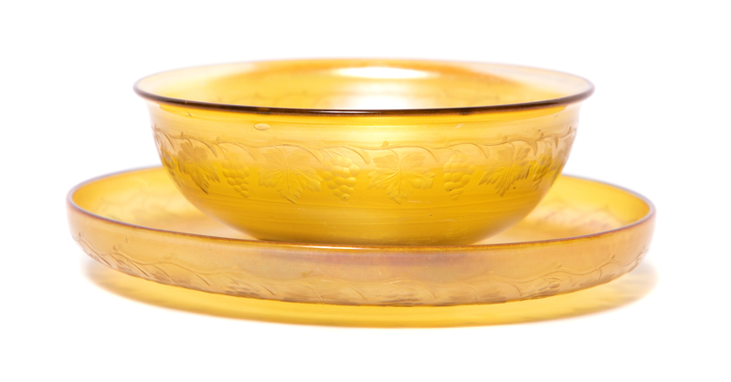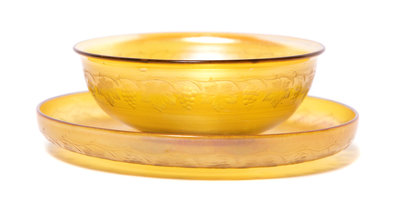 CIRCA 1900the iridescent bowl and stand engraved with a grapevine band, the bowl inscribed LCT, the stand LCT Favrile.