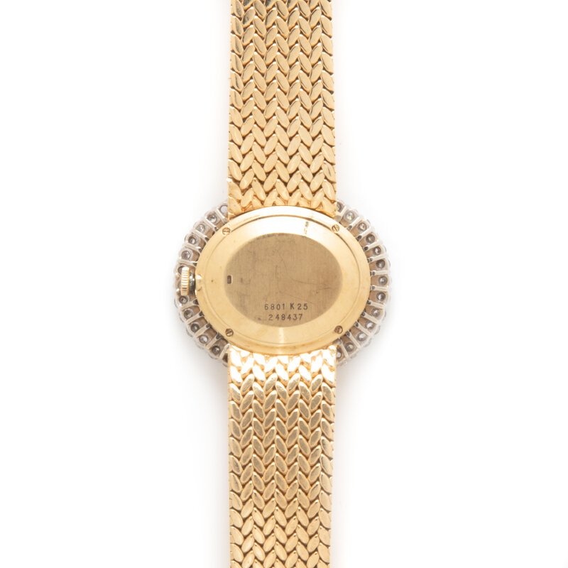 Stamps: Case back: 6801 K25 248437 (Swiss hallmark). Clasp: PIAGET 750.