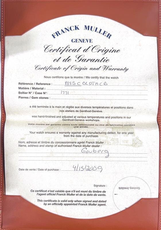 Sold with: Franck Muller inner and outer box, Certificate of Origin and Warranty, black rubber strap, and setting tool