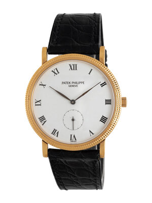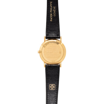 Bracelet/Strap: Black leather signed Patek Philippe with 18K yellow gold Patek Philippe buckle