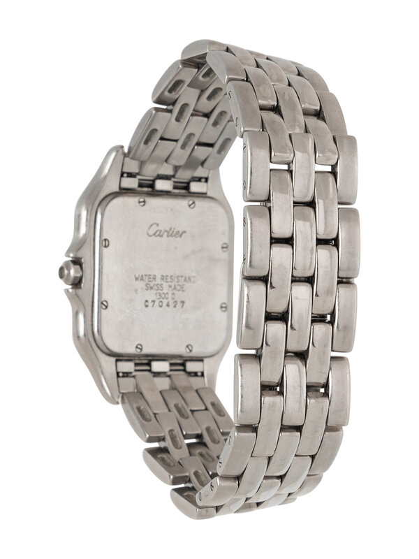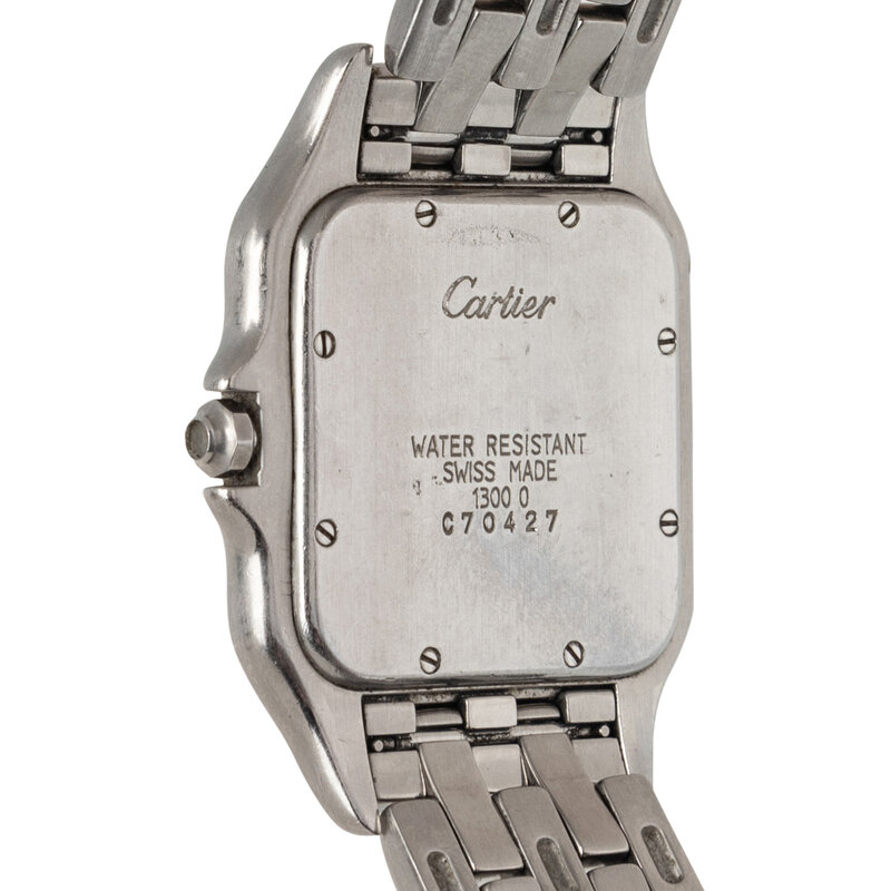 Stamps: Case back: Cartier WATER RESISTANT SWISS MADE 1300 0 C70427. Clasp: Cartier SWISS MADE.