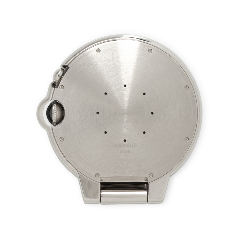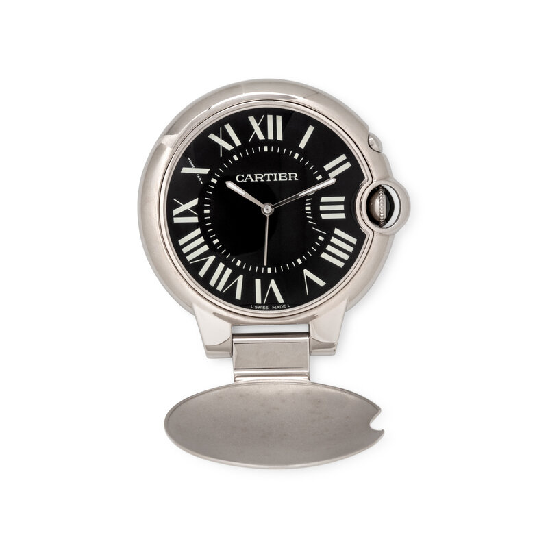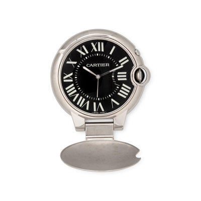 CARTIER, STAINLESS STEEL 'BALLON BLEU' ALARM DESK CLOCK, BOX & PAPERS