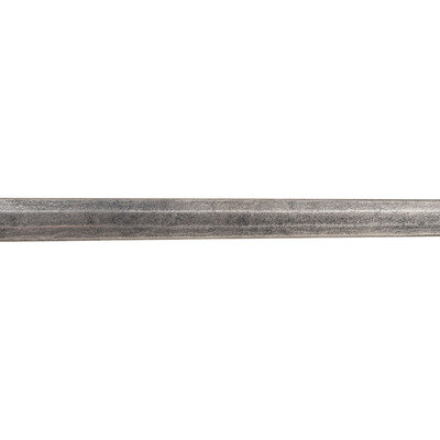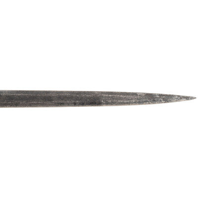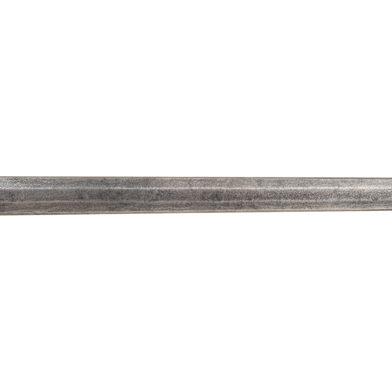 39" blade length. 48" overall with hilt. Straight double edged blade with flattened medial ridge and featuring an elaborate hilt with pierced clamshell guard retained by two screws, and an octagonal profile pommel containing a peened tang. Hilt is wrapped in brass wire braided at both ends. Knuckle bow consists of three conjoined branches in addition to the lower quillon. Sword has been buffed bright, and the tip reshaped at some point, likely due to breakage. Grip appears to be original.