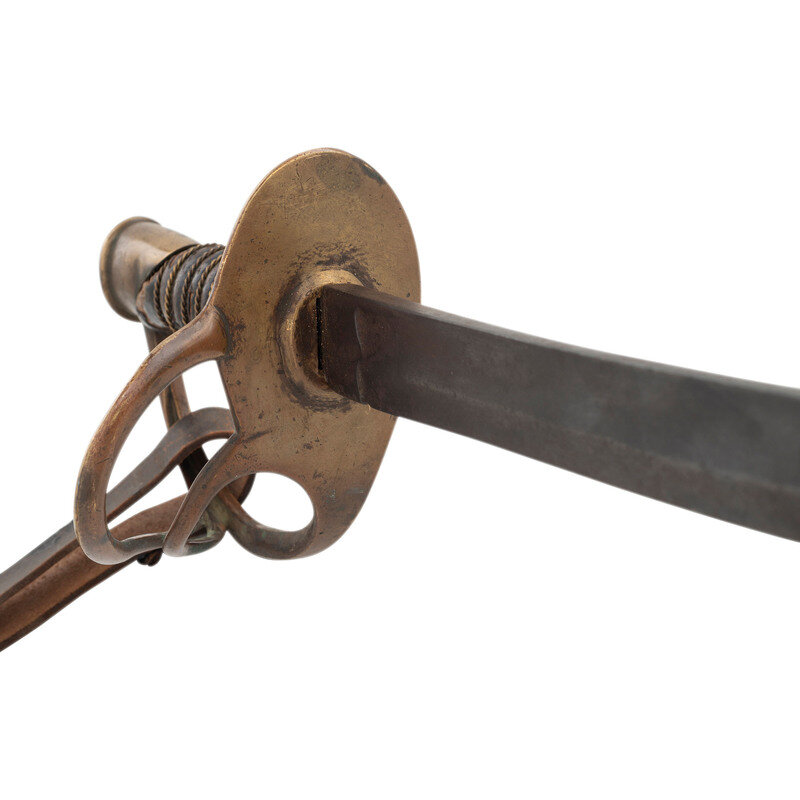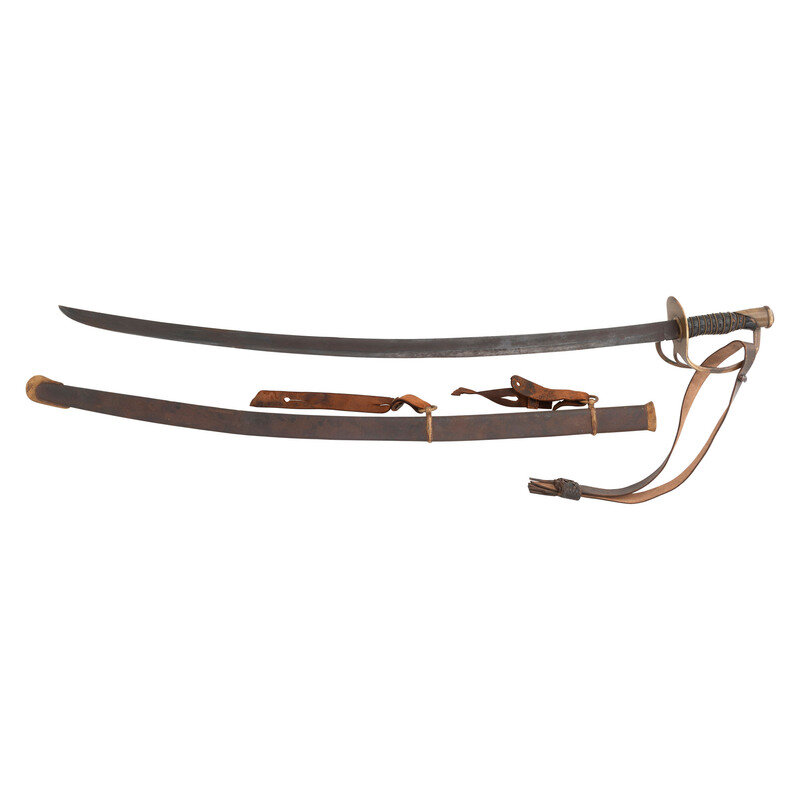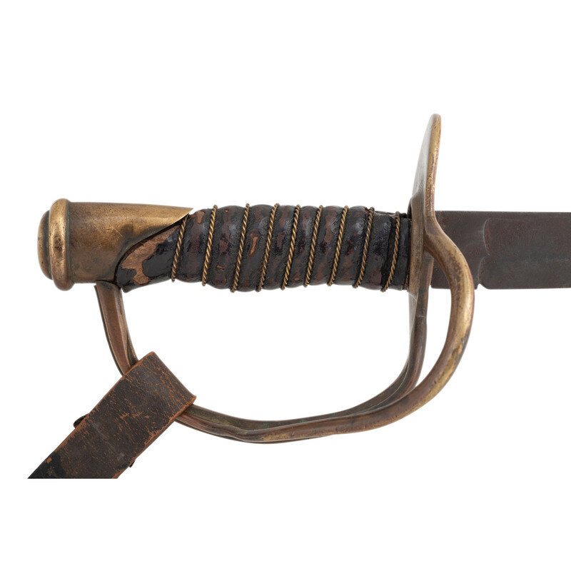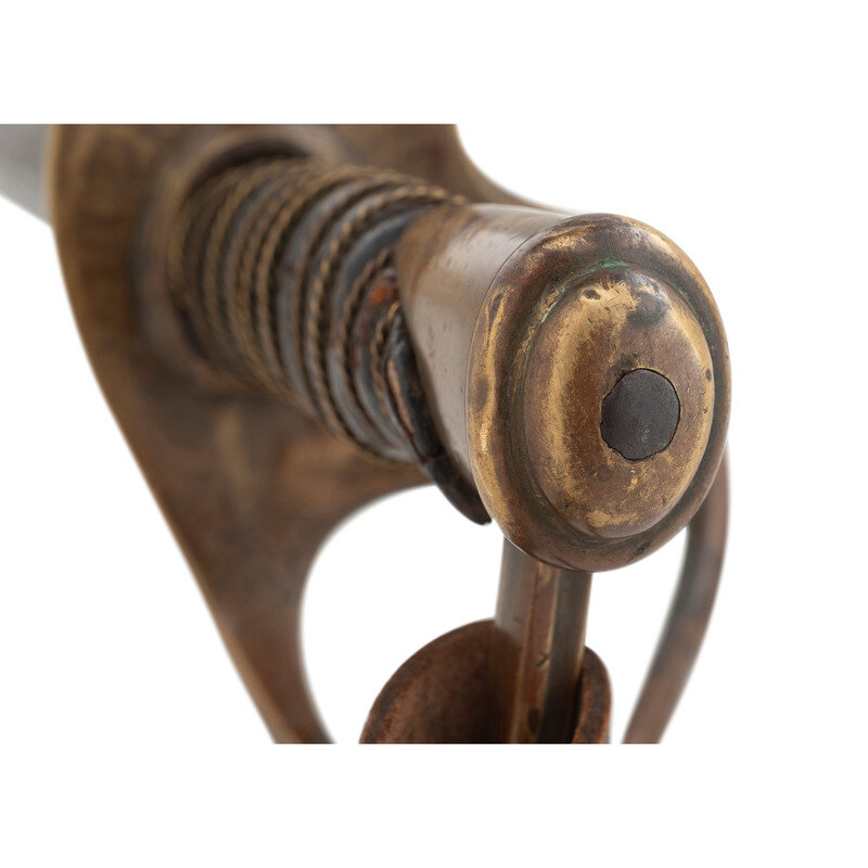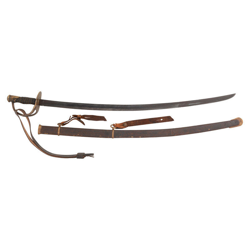 35.25" crude, single-edged curved blade with flat spine, with 28.5" partially stopped median fuller. Blade 1.16" wide at ricasso, overall length 41.25". 5.75" hilt with cast brass two-branch guard and knuckle bow with crude Phrygian helmet pommel cap. Leather covered wood grip with ten wraps of twisted wire. A leather sword knot is attached to the knuckle bow. A quality reproduction brass mounted lap seamed seamed sheet iron scabbard with two suspension mounts and remnants of leather sword hangers accompanies the sword.
