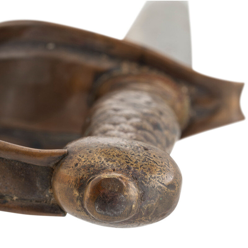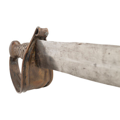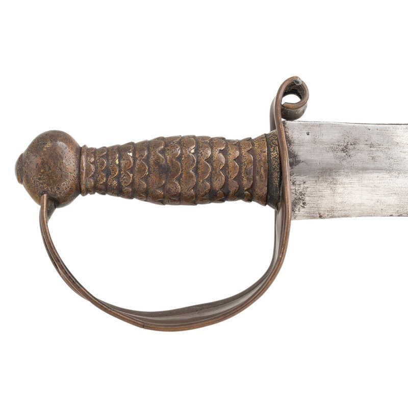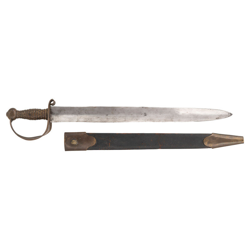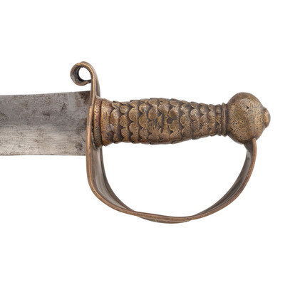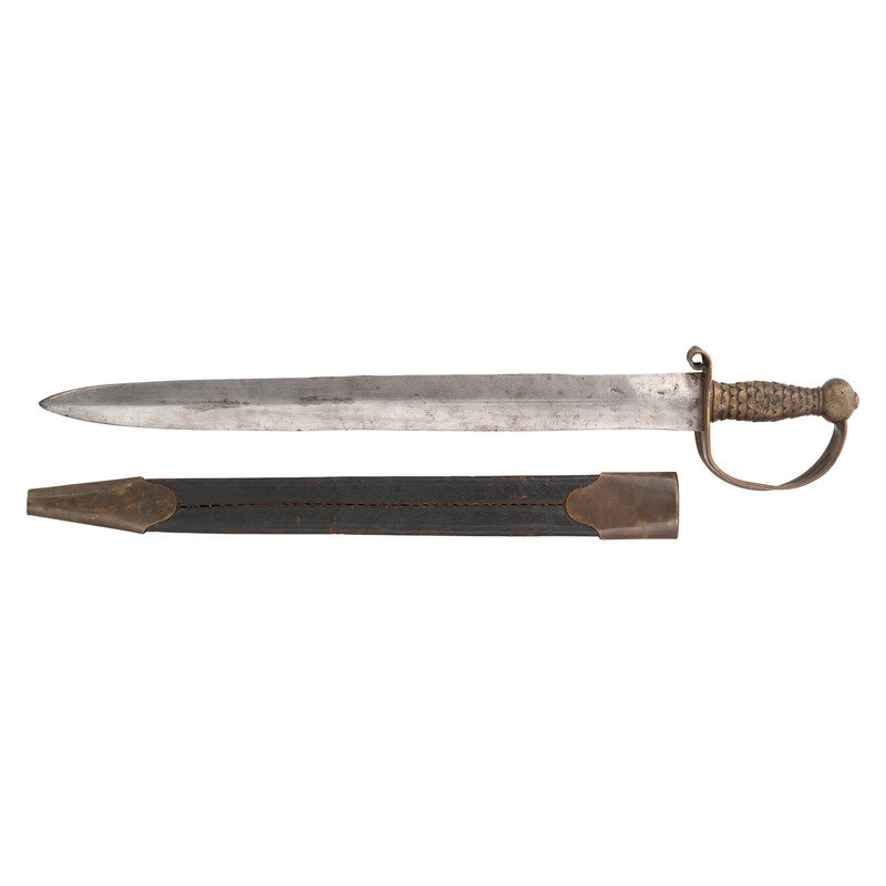 21.375" double-edged, slightly wash-waisted blade with median ridge, 1.9" wide at ricasso. 26.5" in overall length with a 5.125" sand cast brass hilt. Hilt with fish scale pattern gripping surface and sheet brass guard with rolled edges rolled upper quillon. Cutlass is accompanied by a well fit, apparently period brass mounted leather scabbard with a central rear seam and an applied cast frog button on the upper mount that appears to be a replacement.