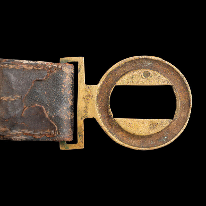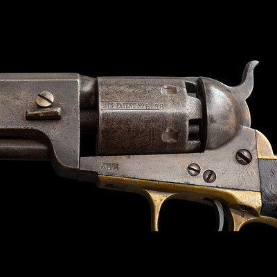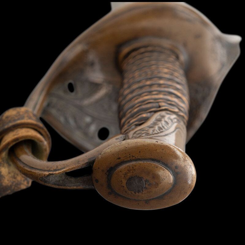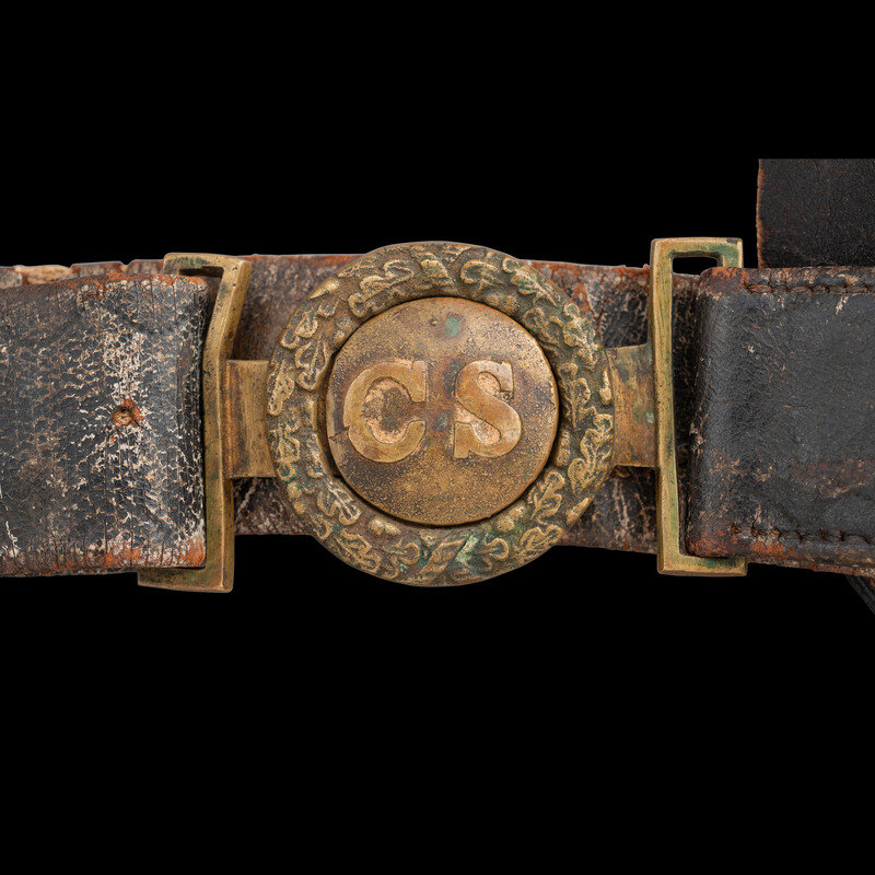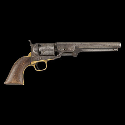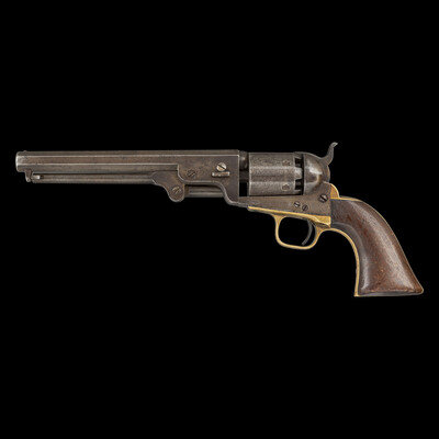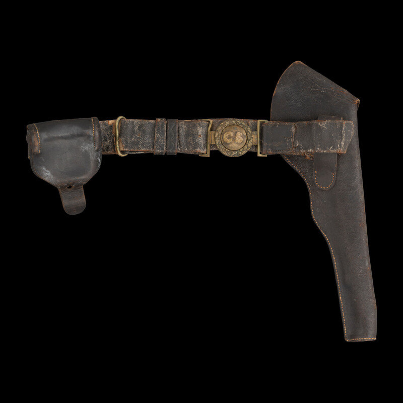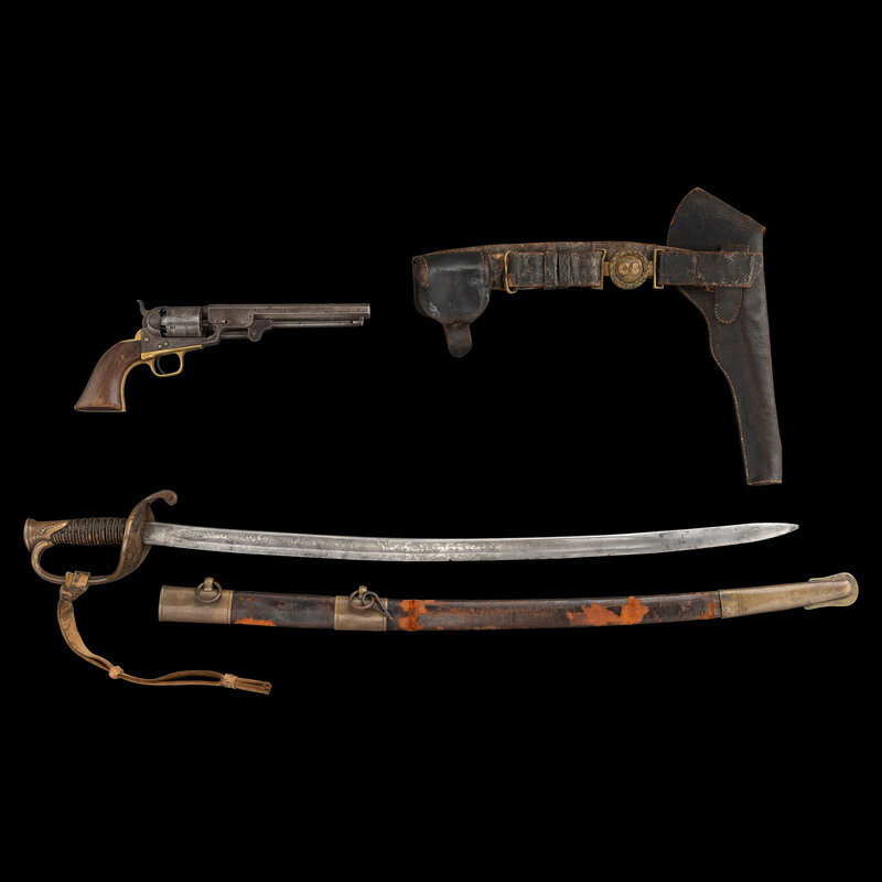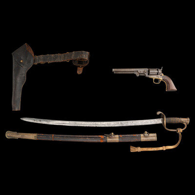 The Mobile produced sword has a slightly curved, single-edged 29.25" blade with a nominally 22" unstopped median fuller. The blade features nominally 18" etched panels on each side with flowing foliate patterns and the presentation noted above. The sand cast brass hilt is decorated with flowing foliate themes on the face of the guard, as well as the letters CS and has a simple grooved knuckle bow. The grip is of grooved polished wood with fourteen wraps of twisted wire. A blackened buff leather sword knot is attached to the guard. The sword is accompanied by a brass mounted leather scabbard with a central rear seam with the throat attached by two pins on the reverse. Suspension rings are attached to the upper and middle mounts. Included in the grouping are a folded and sewn leather belt attributed to Leech & Rigdon with a two-piece sand cast CS tongue and wreath plate (Mullinax #047) which has a US cap pouch marked DINGEE & LORIGAN/MAKERS/NEW YORK attached to it, along with a flap holster for a Colt Navy revolver. A civilian Colt Model 1851 Navy Revolver is also included with the archive. The revolver is .36 caliber with a 7.5" octagonal barrel and is serial number 125278, indicating production in 1862. The revolver retains no finish, has the standard one-line New York address of that period and all visible serial numbers match. The wedge and wedge screw are replacements, as is the loading lever retention screw. The initials RM are scratched into the butt of the revolver.