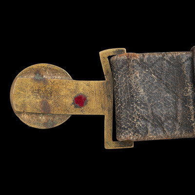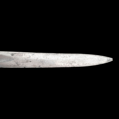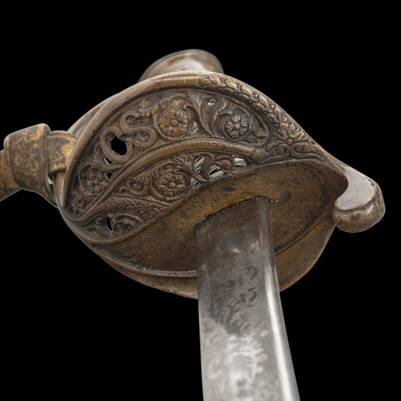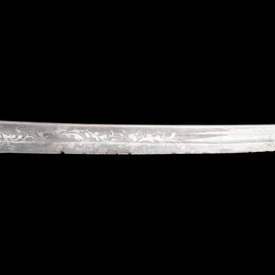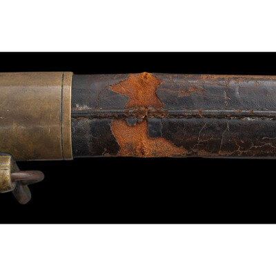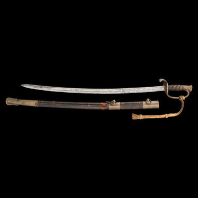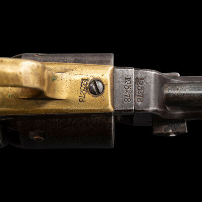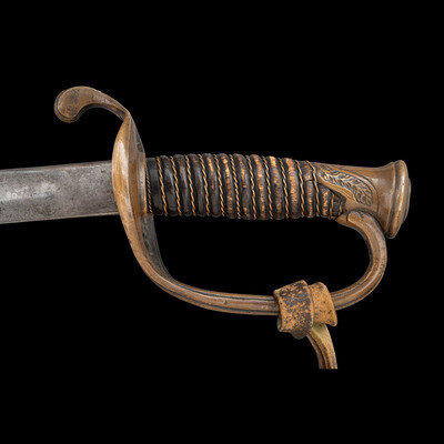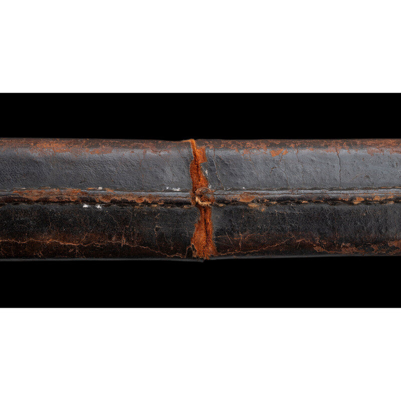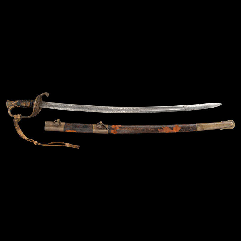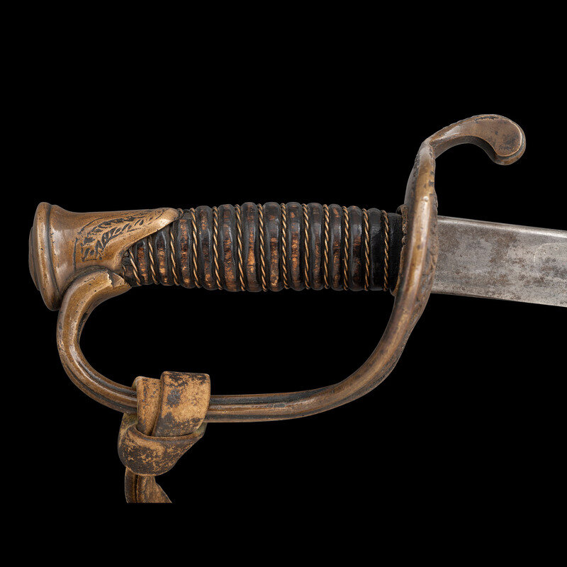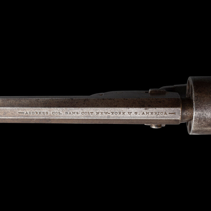The Mobile produced sword has a slightly curved, single-edged 29.25" blade with a nominally 22" unstopped median fuller. The blade features nominally 18" etched panels on each side with flowing foliate patterns and the presentation noted above. The sand cast brass hilt is decorated with flowing foliate themes on the face of the guard, as well as the letters CS and has a simple grooved knuckle bow. The grip is of grooved polished wood with fourteen wraps of twisted wire. A blackened buff leather sword knot is attached to the guard. The sword is accompanied by a brass mounted leather scabbard with a central rear seam with the throat attached by two pins on the reverse. Suspension rings are attached to the upper and middle mounts. Included in the grouping are a folded and sewn leather belt attributed to Leech & Rigdon with a two-piece sand cast CS tongue and wreath plate (Mullinax #047) which has a US cap pouch marked DINGEE & LORIGAN/MAKERS/NEW YORK attached to it, along with a flap holster for a Colt Navy revolver. A civilian Colt Model 1851 Navy Revolver is also included with the archive. The revolver is .36 caliber with a 7.5" octagonal barrel and is serial number 125278, indicating production in 1862. The revolver retains no finish, has the standard one-line New York address of that period and all visible serial numbers match. The wedge and wedge screw are replacements, as is the loading lever retention screw. The initials RM are scratched into the butt of the revolver.
