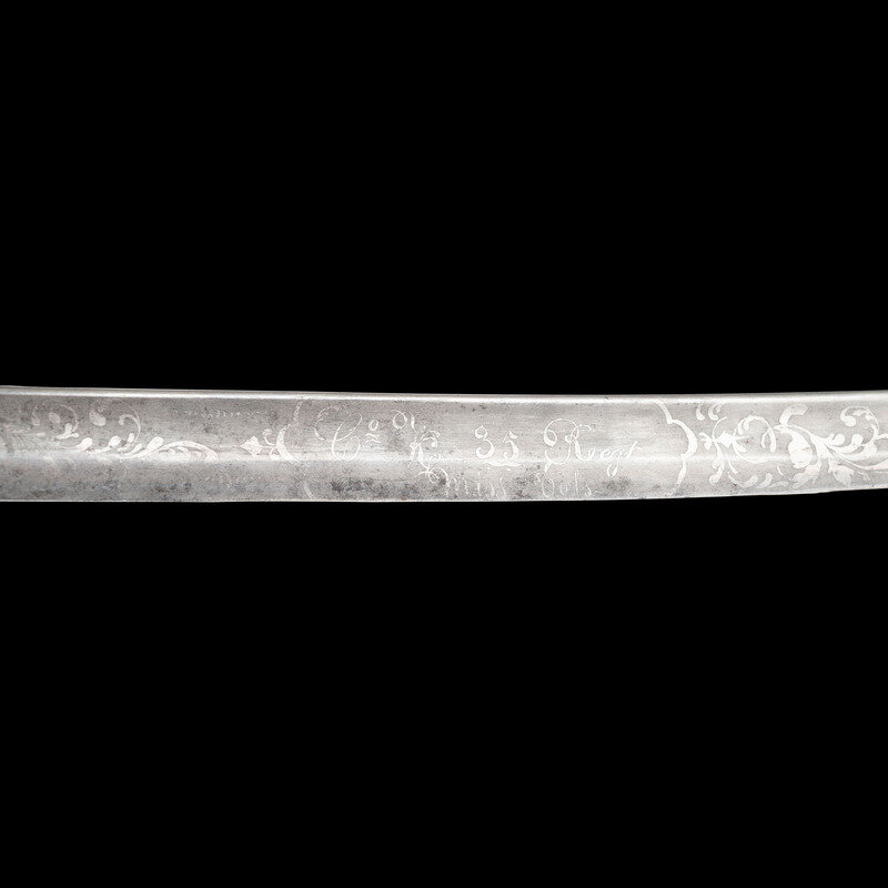 Ruben Henley Shotwell (1830-1910) was born in Huntsville, AL and prior to the war worked as a farmer, a grocer and dried goods retailer. In 1861 he was living in Mobile, AL working as a partner in Shotwell, Curry & Co. grocers. He joined the 35th Mississippi Infantry in West Point, MS in March of 1862 and was commissioned the Captain of the Company K in April. Shotwell's pre-war ties to the Mobile, AL business community suggest that he probably knew both Conning and Fraser and explain a Mobile-made sword for a Mississippi infantry company commander. The 35th Mississippi was engaged in the Battle of Corinth in October 1862 and Shotwell was wounded and captured at that time. He was subsequently paroled and rejoined his command, only to be captured again when the entire Vicksburg garrison was surrendered on July 4, 1863. According to at least one obituary, Shotwell was wounded no less than five times in service, although available records only mention two wounds. At the time of the regiment's surrender at Vicksburg Shotwell was listed as being the "acting Major" for the regiment. The 35th Mississippi took part in the Atlanta Campaign during 1864, seeing combat at New Hope Church, Kennesaw Mountain and during the Battle of Atlanta itself. By the time that campaign began, Shotwell was serving as the Lt. Colonel for the regiment, with the commission dating to August of 1863, likely coinciding with the parole from the Vicksburg capture. Shotwell served as the regimental commander for at least part of the campaign, after Colonel Barry was wounded at Altoona. The regiment then returned to Tennessee with the balance of Hood's army, and saw fighting at the Battles of Franklin and Nashville. Shotwell was wounded at Nashville with a gunshot wound to the left thigh. The regiment was captured a final time at Fort Blakely, near Mobile on April 9, 1865 and was formally surrendered on May 4 in Cintronelle, AL. After the war, Shotwell initially retuned to West Point, MS where he worked as both a farmer and dry goods proprietor. He married in 1868 and eventually relocated to St. Louis where he worked as a clerk in the elections office. Shotwell died in St. Louis on August 17, 1910 at the age of 87 and was buried in Florence, AL where his wife Rebecca had previously been interred.