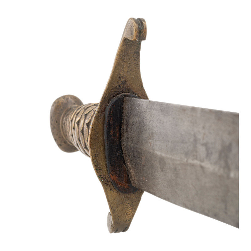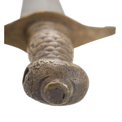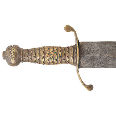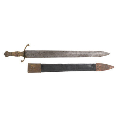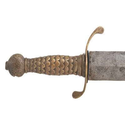 21.25" double-edged unfullered spear point blade with median ridge, 1.85" wide at the ricasso. 26.5" in overall length with a 5.125" sand cast brass hilt. Hilt with fish scale pattern grip and bulbous pommel cap and slot in bottom for the end of a traditional cutlass basket guard. Hilt with 5" long S-hilt with the upper half forward swept and the lower one rearward swept, and the upper half longer than the lower one. The cutlass is accompanied by an incorrect composite brass mounted leather scabbard that is a little short of being long enough for the cutlass.