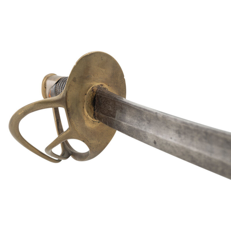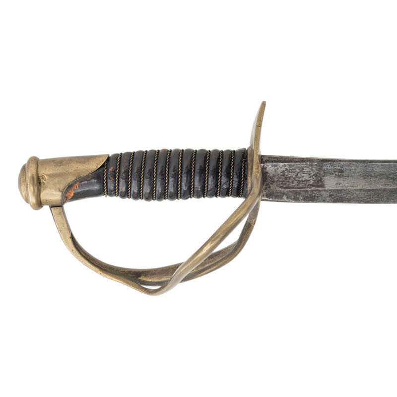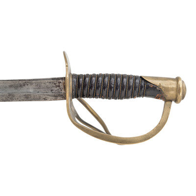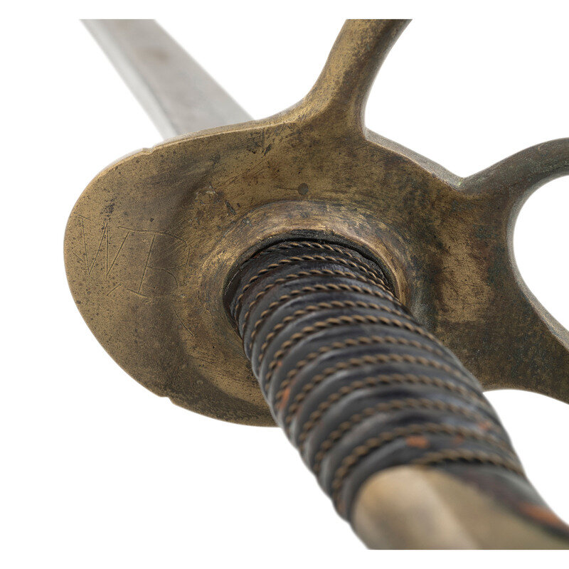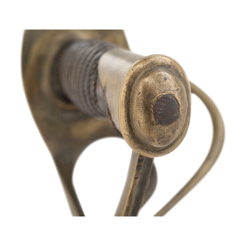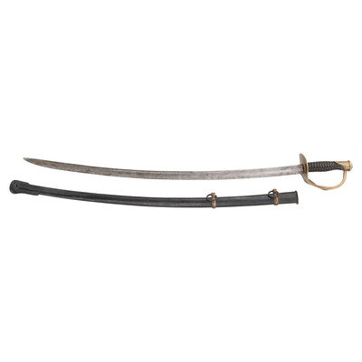 34.25" curved single-edged blade with a flat spine and a 26.5" unstopped fuller that passes through the guard into the hilt. 1.18" wide blade at ricasso, overall length 40.25". 6" hilt with heavy cast brass guard with two branches and a knuckle bow and the typical Phrygian helmet pommel cap. Cord wrapped wood grips with leather covering and twelve wraps of twisted wire. An obvious casting flaw is present on right side of the pommel cap. The initials "WB" are scratched into the inner face of the upper portion of the guard. The sword is accompanied by a well made lap-seamed sheet iron scabbard with brass suspension mounts that may be a Haiman product rather than one by Leech & Rigdon.