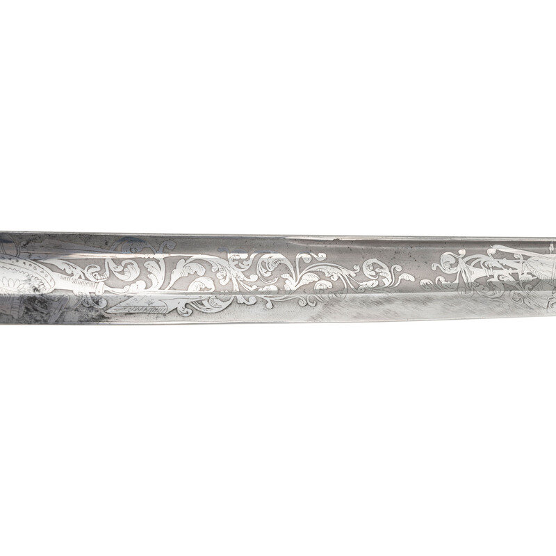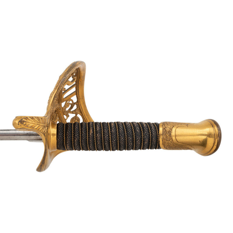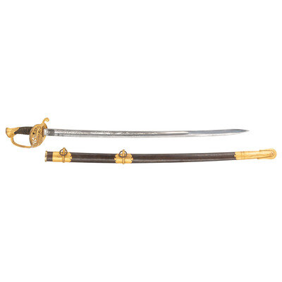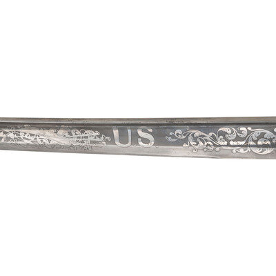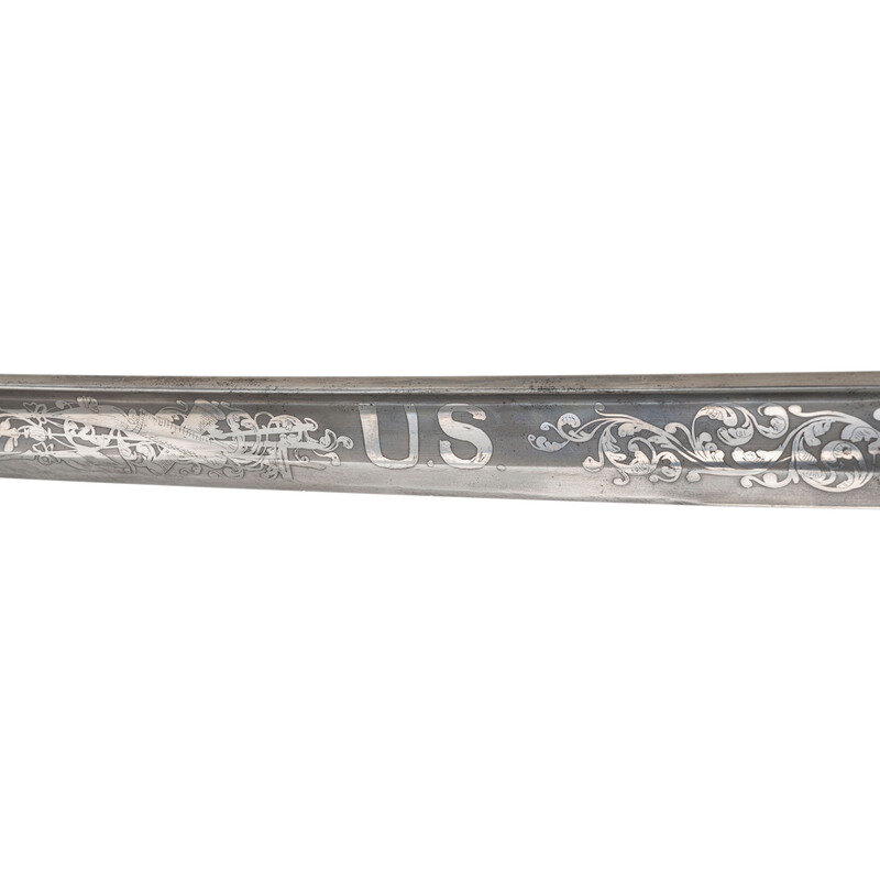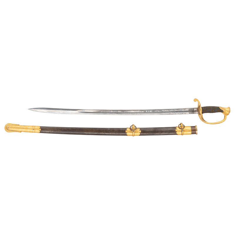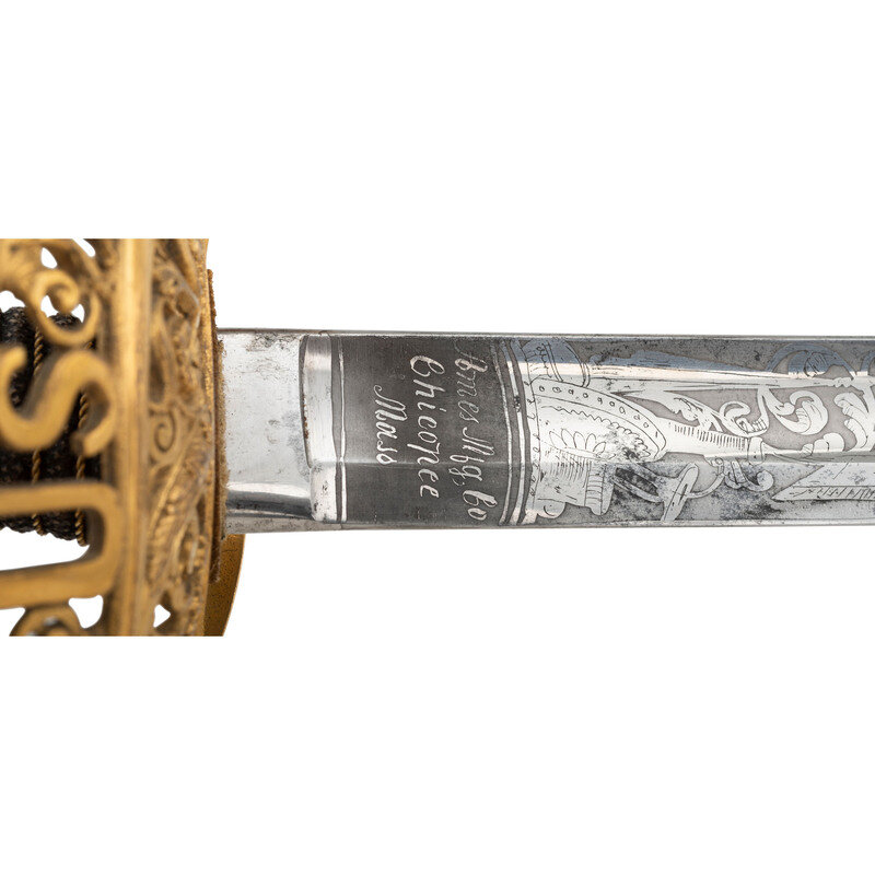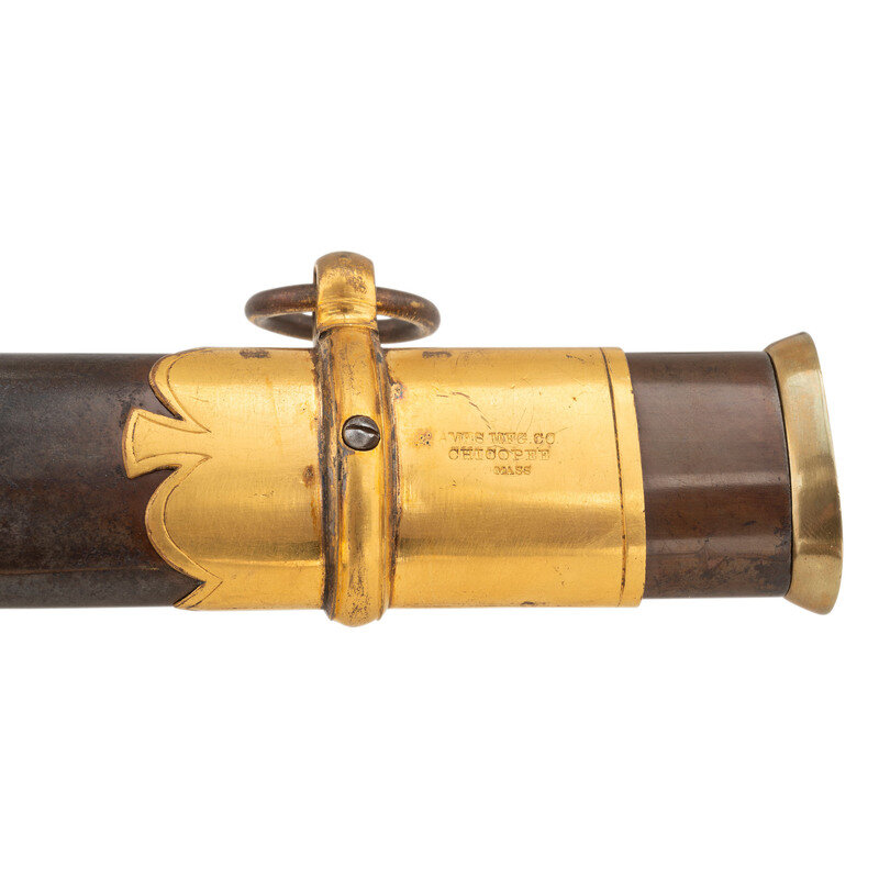31.5" single edged spear point blade with 22.75" stopped median fuller. Blade 1.1" wide at ricasso. 36.25" in overall length with a 5.75" gilt cast brass hilt with US in the face of the guard. Grooved wood grip covered in shagreen with 15 wraps of multi-strand wire. Blade etched with floral, martial and patriotic motifs. Reverse ricasso etched in three lines Ames Mfg. Co./Chicopee/Mass. The sword is accompanied by a browned steel scabbard with gilt brass mounts. The reverse of the upper mount is marked in three lines: AMES MFG. Co./CHICOPEE/MASS. A rather striking Ames Staff & Field sword overall.