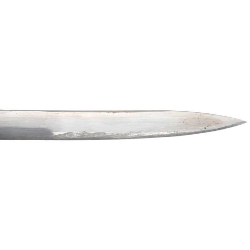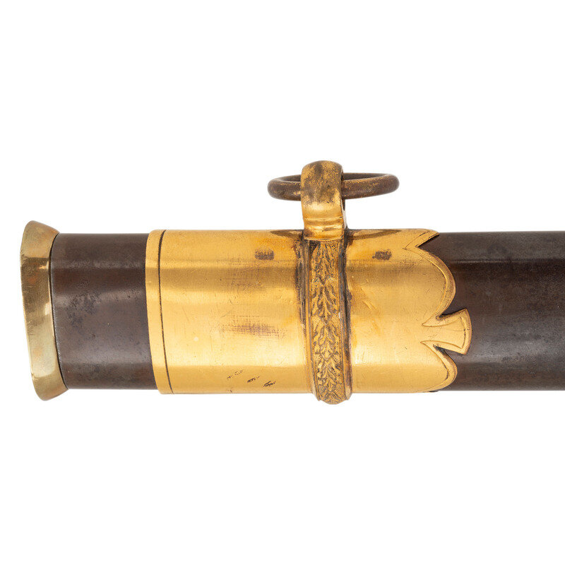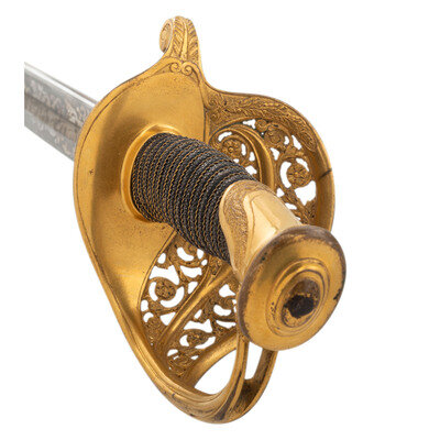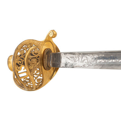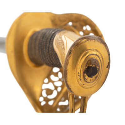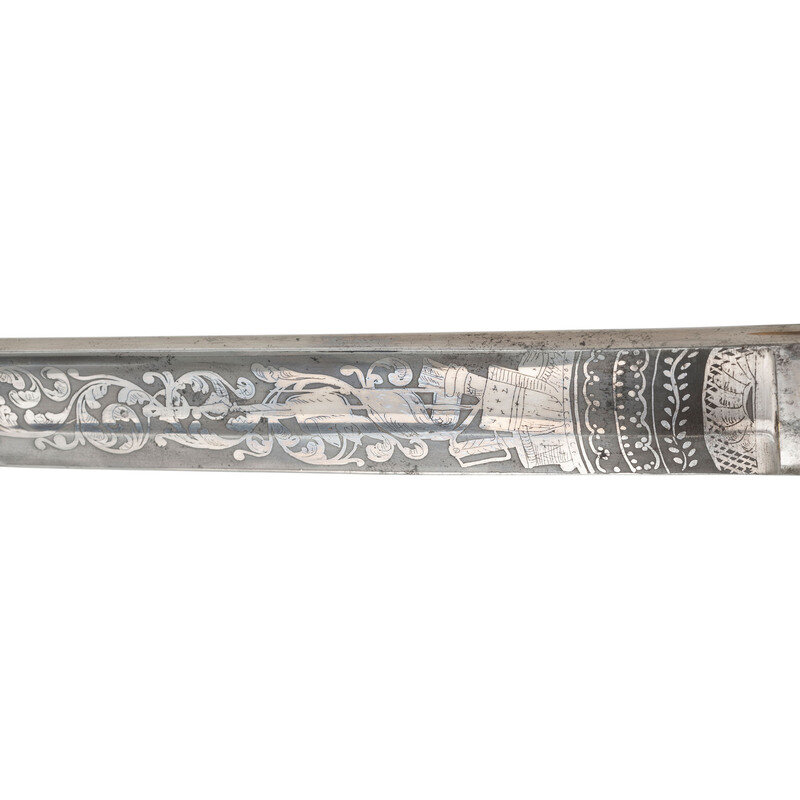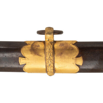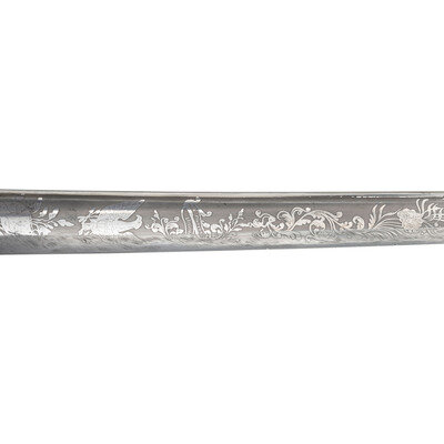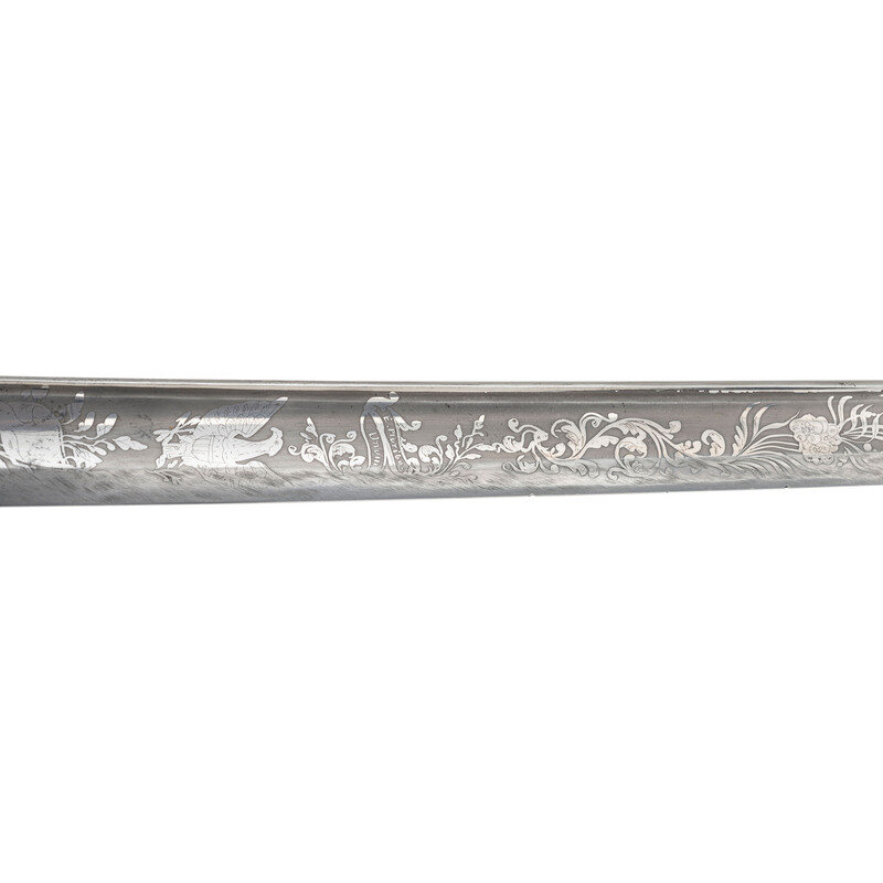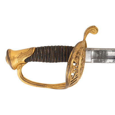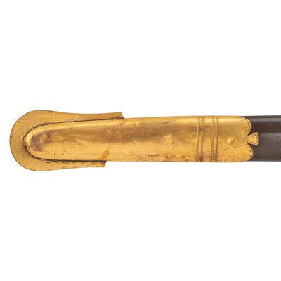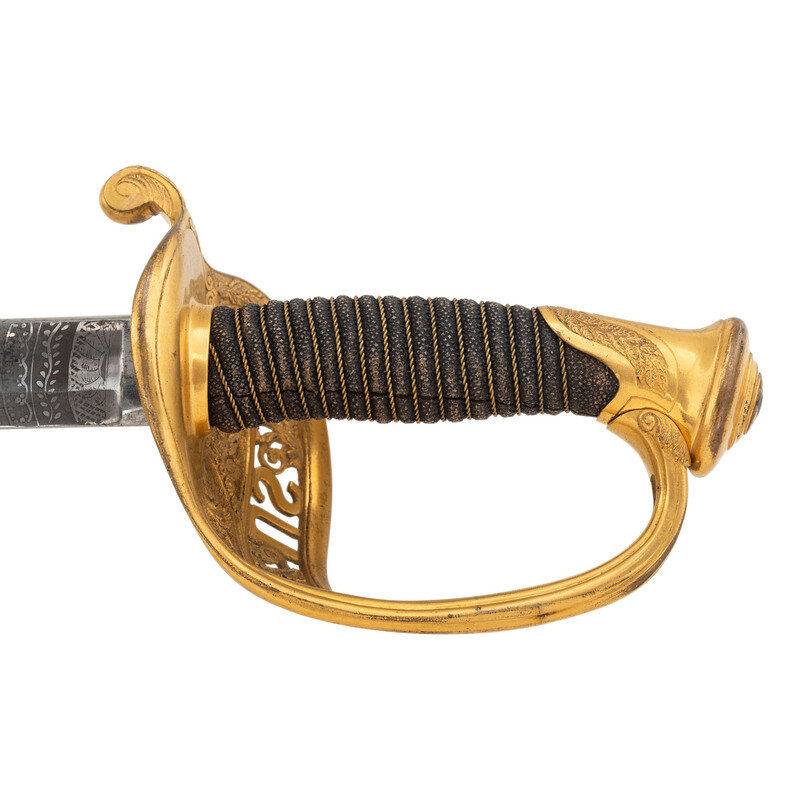31.5" single edged spear point blade with 22.75" stopped median fuller. Blade 1.1" wide at ricasso. 36.25" in overall length with a 5.75" gilt cast brass hilt with US in the face of the guard. Grooved wood grip covered in shagreen with 15 wraps of multi-strand wire. Blade etched with floral, martial and patriotic motifs. Reverse ricasso etched in three lines Ames Mfg. Co./Chicopee/Mass. The sword is accompanied by a browned steel scabbard with gilt brass mounts. The reverse of the upper mount is marked in three lines: AMES MFG. Co./CHICOPEE/MASS. A rather striking Ames Staff & Field sword overall.