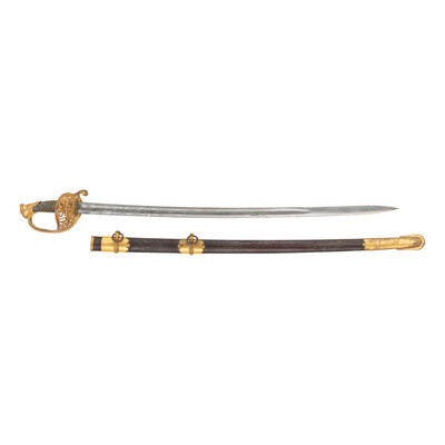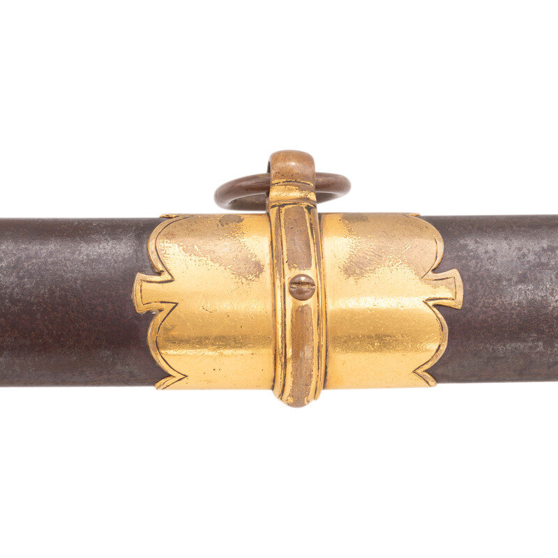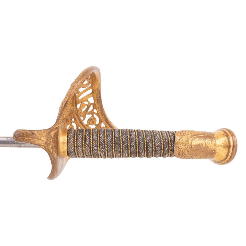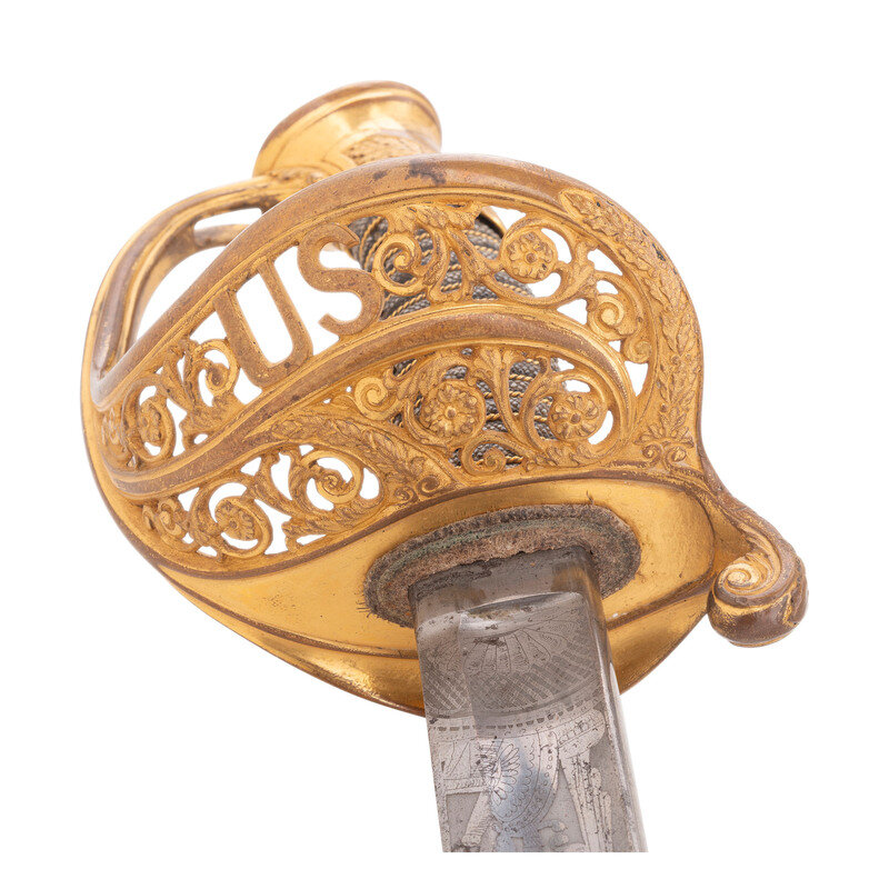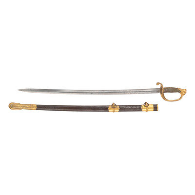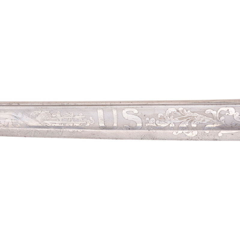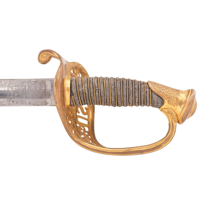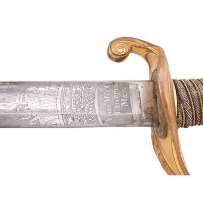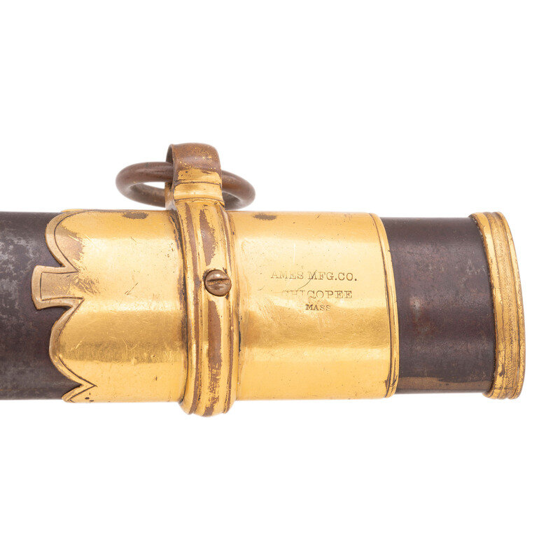 32" single edged spear point blade with 22.75" stopped median fuller. Blade 1.1" wide at ricasso. 38" in overall length with a 6" gilt cast brass hilt with US in the face of the guard. Grooved wood grip covered in shagreen with 15 wraps of multi-strand wire. Blade etched with floral, martial and patriotic motifs. Reverse ricasso etched in three lines Ames Mfg. Co./Chicopee/Mass. The sword is accompanied by a browned steel scabbard with gilt brass mounts. The reverse of the upper mount is marked in three lines: AMES MFG. Co./CHICOPEE/MASS. Overall a much better than average Ames Staff & Field sword.