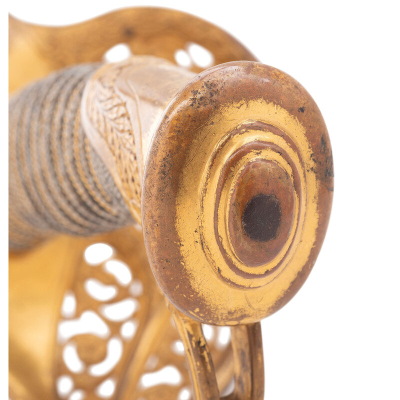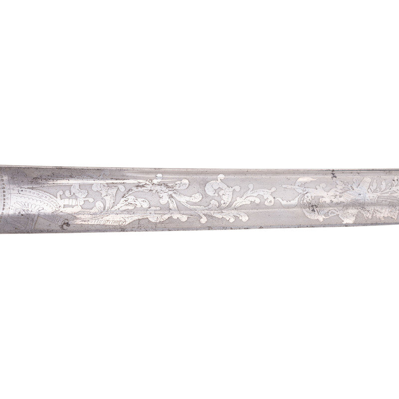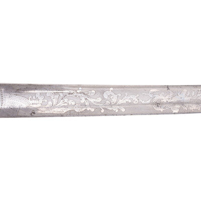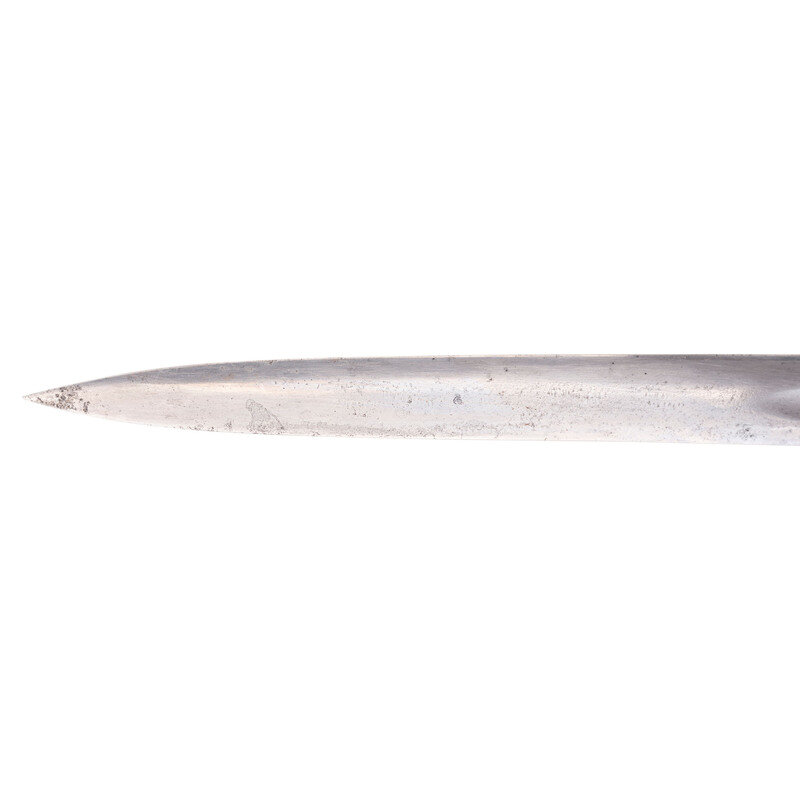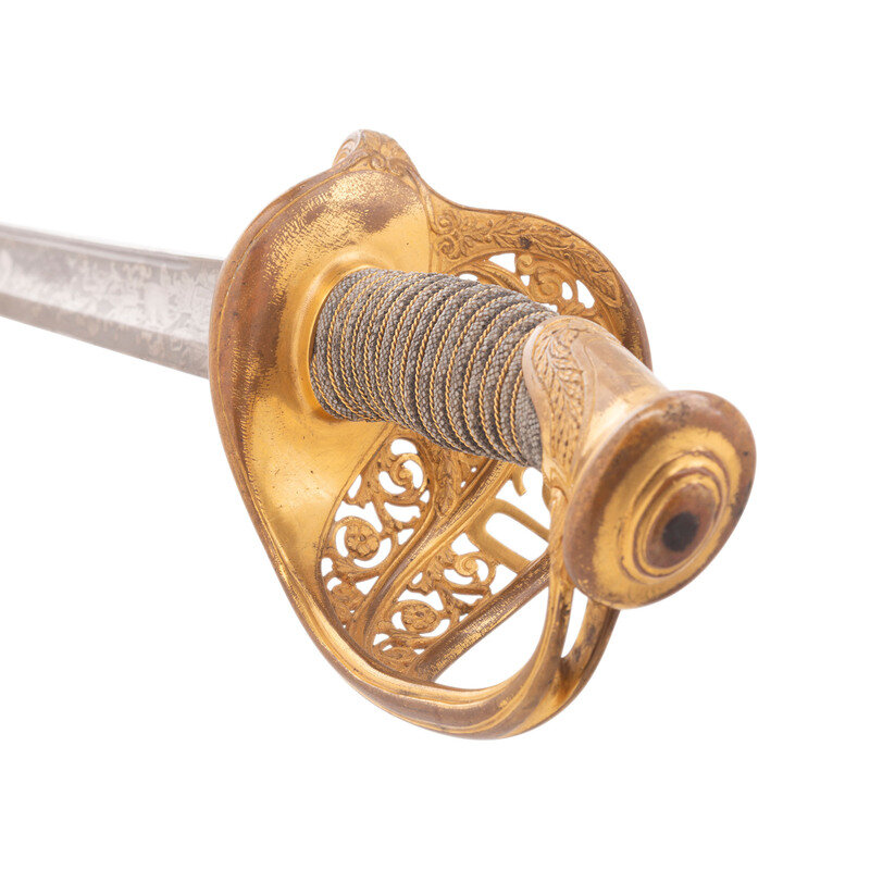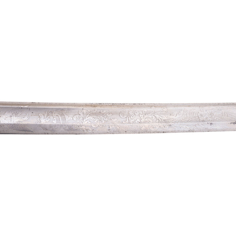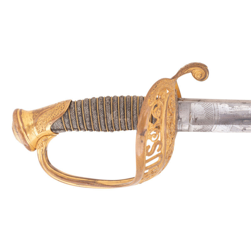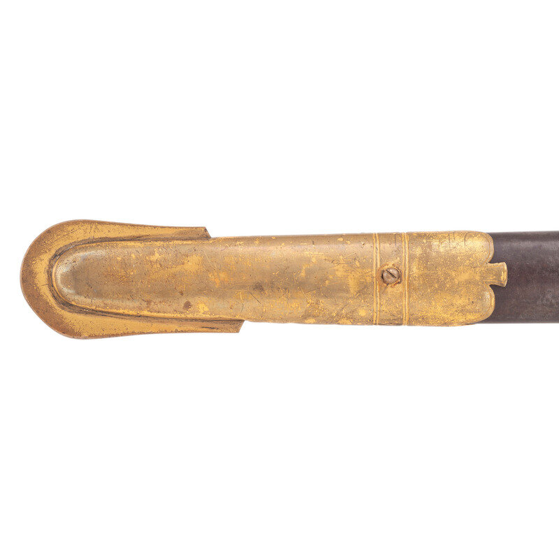 32" single edged spear point blade with 22.75" stopped median fuller. Blade 1.1" wide at ricasso. 38" in overall length with a 6" gilt cast brass hilt with US in the face of the guard. Grooved wood grip covered in shagreen with 15 wraps of multi-strand wire. Blade etched with floral, martial and patriotic motifs. Reverse ricasso etched in three lines Ames Mfg. Co./Chicopee/Mass. The sword is accompanied by a browned steel scabbard with gilt brass mounts. The reverse of the upper mount is marked in three lines: AMES MFG. Co./CHICOPEE/MASS. Overall a much better than average Ames Staff & Field sword.