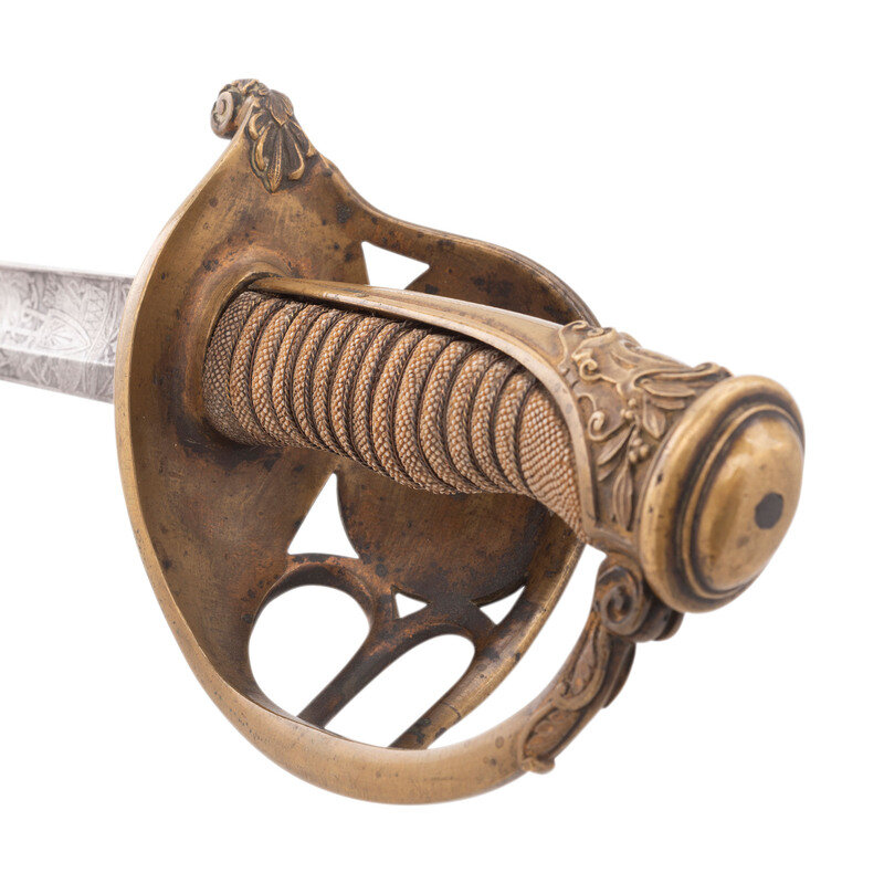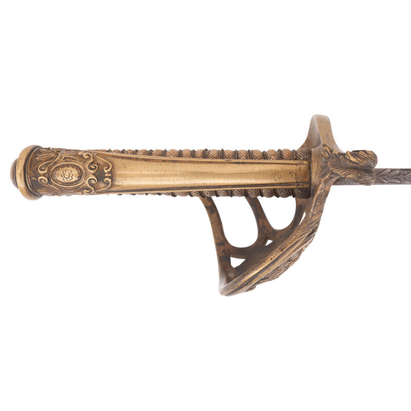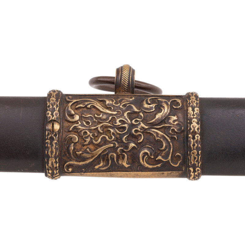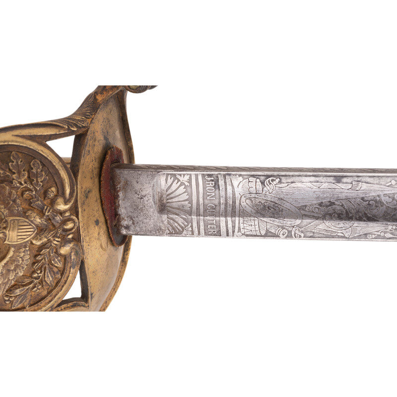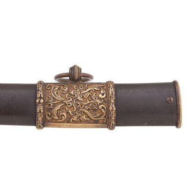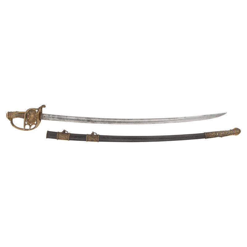 34" single edged spear point, slightly curved blade, 1.1" wide at the ricasso with a 25" stopped median fuller. 6" ornate brass hilt with chased Spread-Winged Eagle motif in the face of the guard, full blackstrap and knuckle bow with two branch guard. Grooved wood grip covered in shagreen with 14 wraps of multi-strand wire. Reverse ricasso stamped PDL and obverse etched IRON CUTTER. Blade etched with flowing foliate and martial themes. Browned steel scabbard with chased gilt brass mounts.