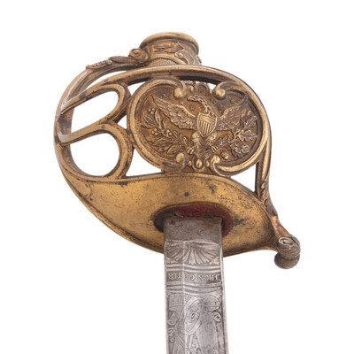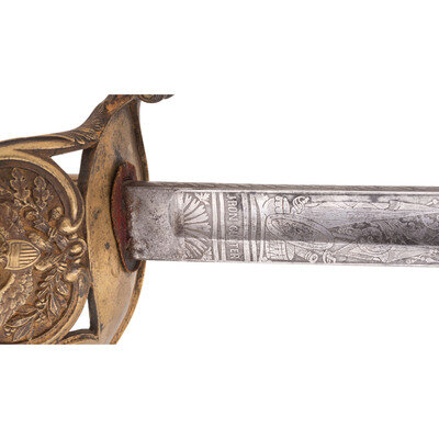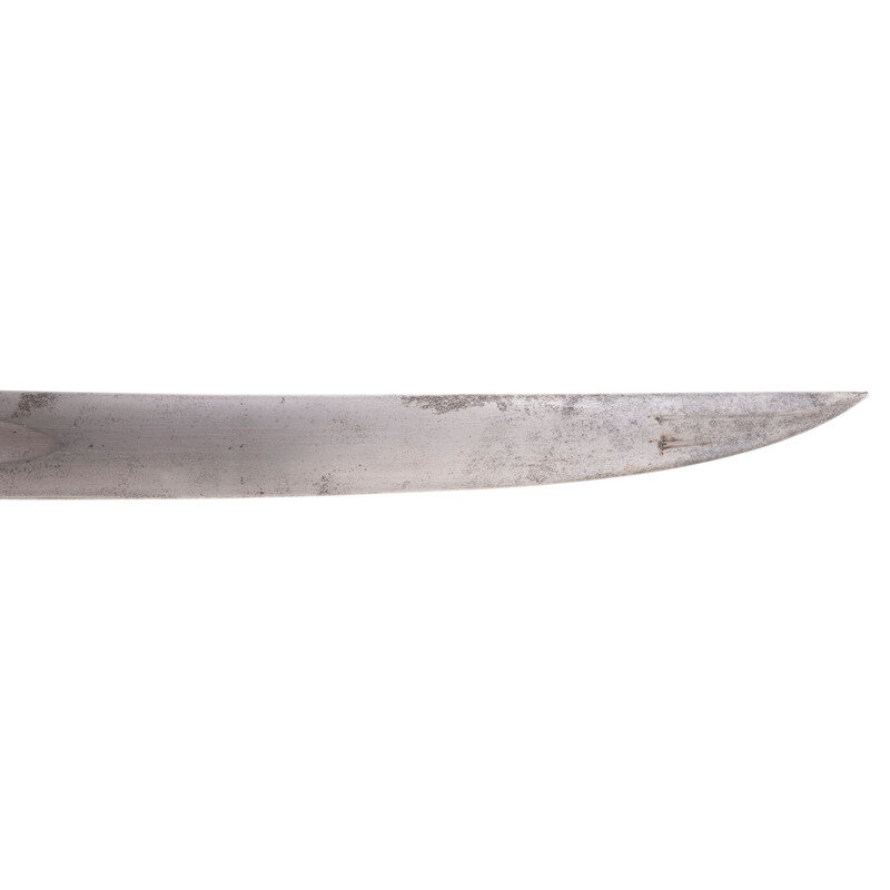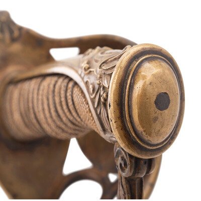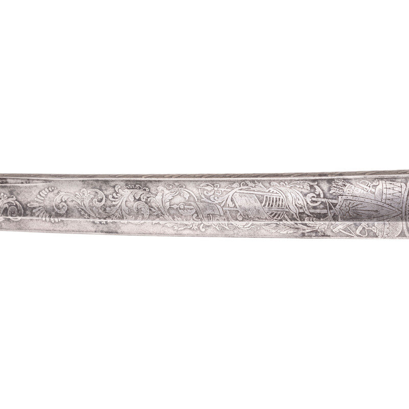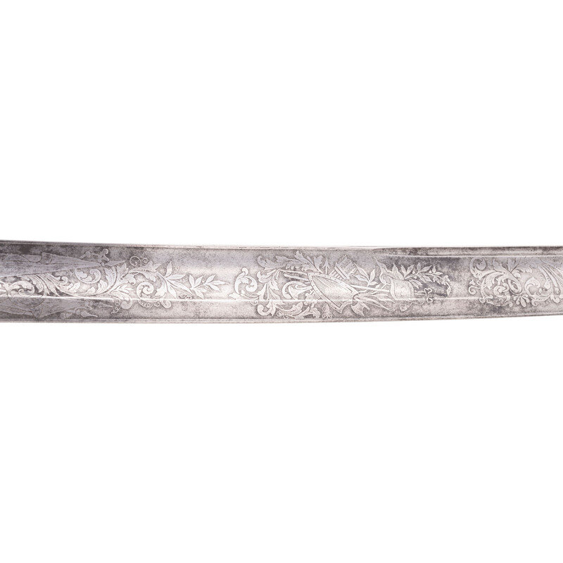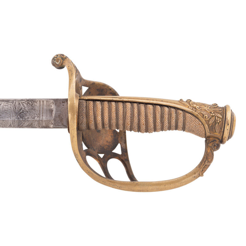 34" single edged spear point, slightly curved blade, 1.1" wide at the ricasso with a 25" stopped median fuller. 6" ornate brass hilt with chased Spread-Winged Eagle motif in the face of the guard, full blackstrap and knuckle bow with two branch guard. Grooved wood grip covered in shagreen with 14 wraps of multi-strand wire. Reverse ricasso stamped PDL and obverse etched IRON CUTTER. Blade etched with flowing foliate and martial themes. Browned steel scabbard with chased gilt brass mounts.