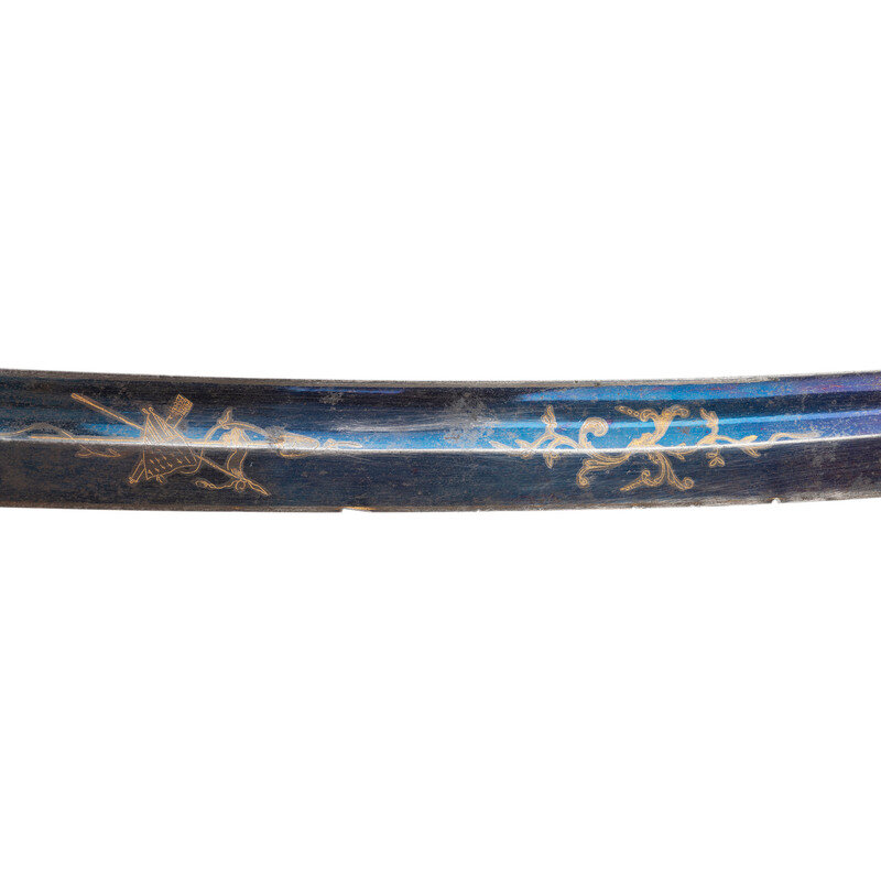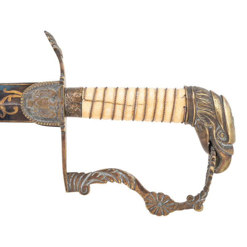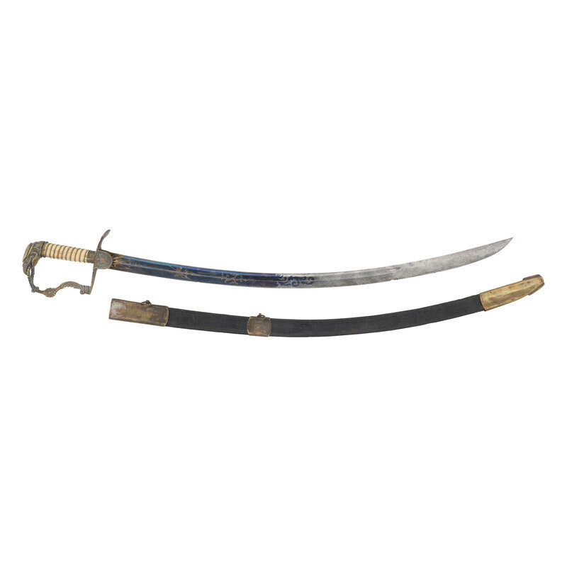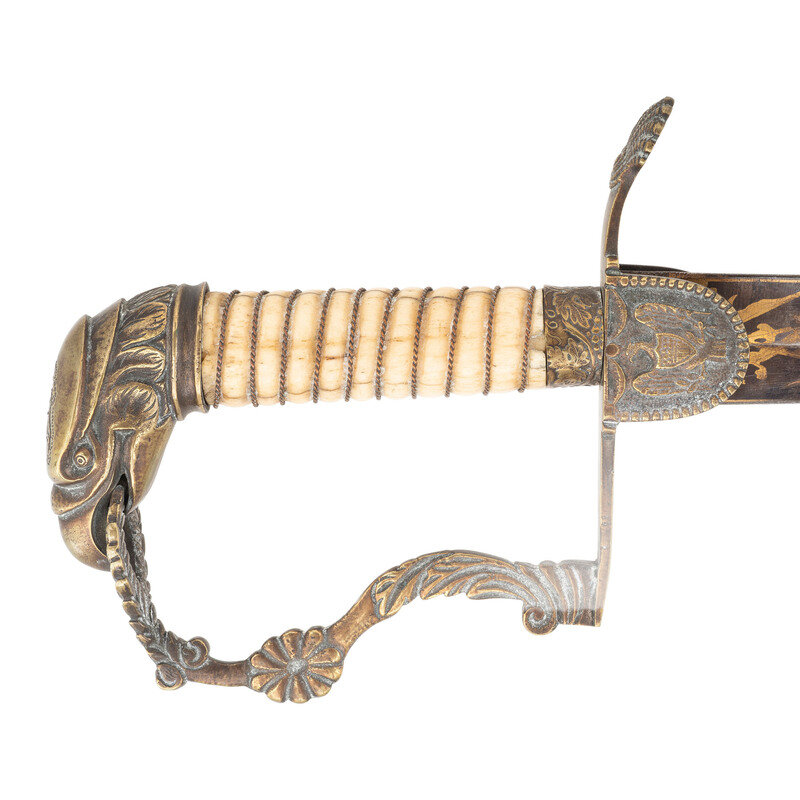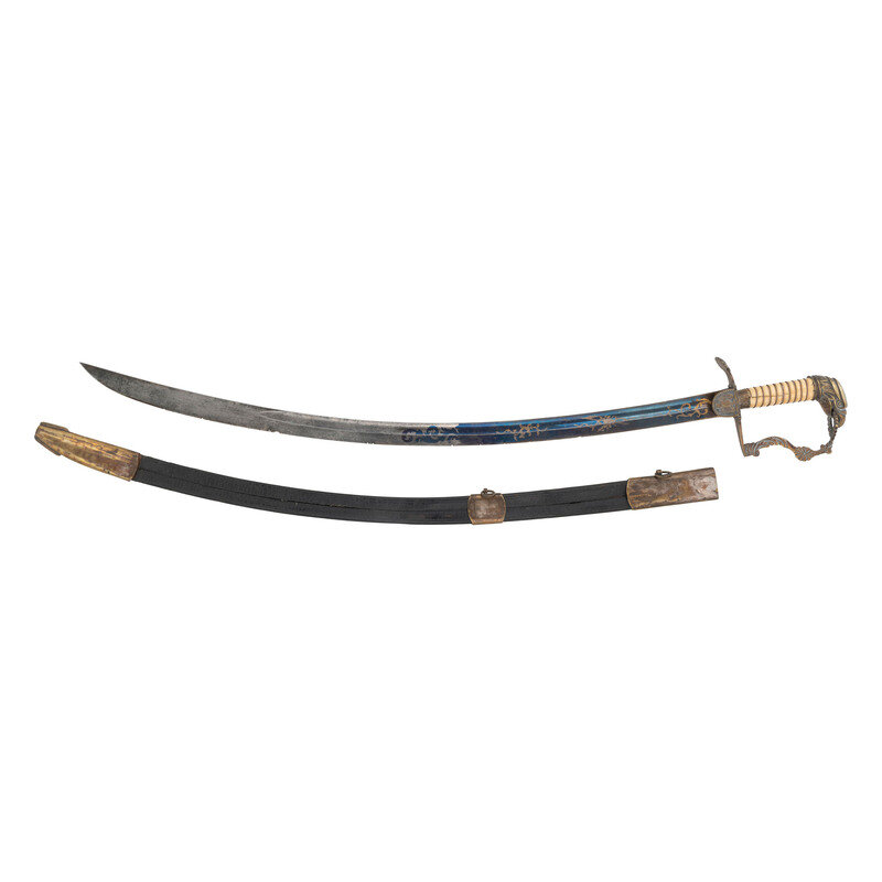 3" curved, singled edged-blade with 21.5" stopped median fuller. Blade 1.2" wide at ricasso. Overall length 35". 5.25" Eagle Head hilt with rococo reverse-P knuckle bow, shell motif quillon and Eagle motif shield shaped langets. Grooved bone grip with 11 wraps of twisted wire. Blued and gilt blade decorated with floral, martial and patriotic motifs. The sword is accompanied by a silvered brass mounted leather scabbard. Likely 1st quarter of the 19th century.