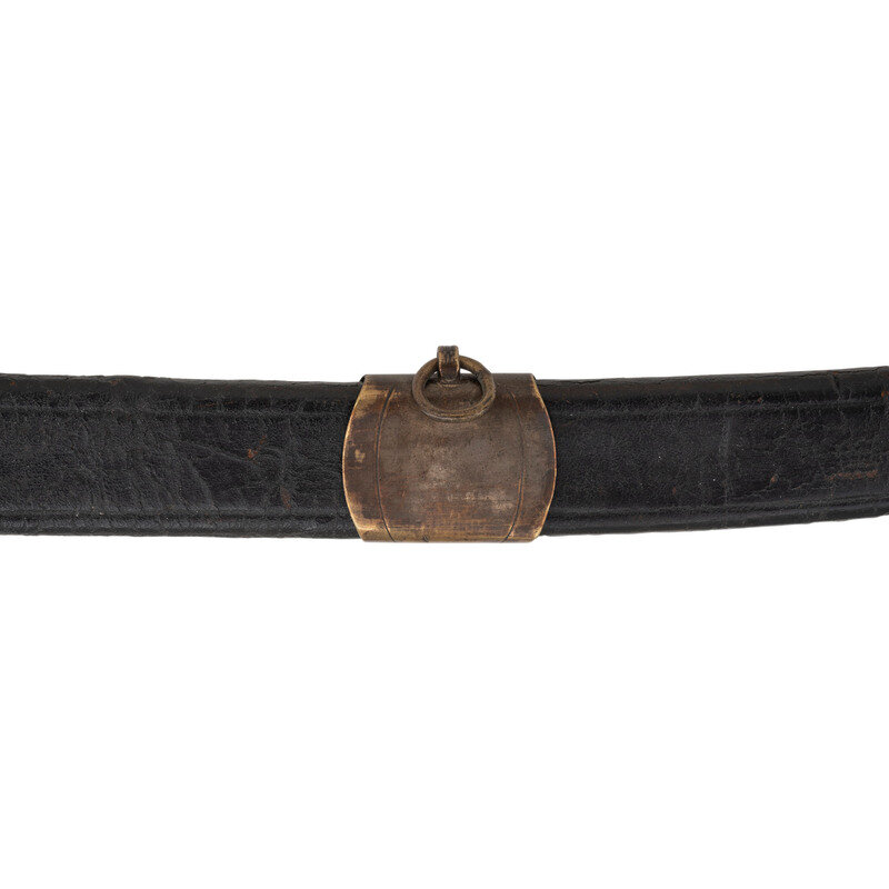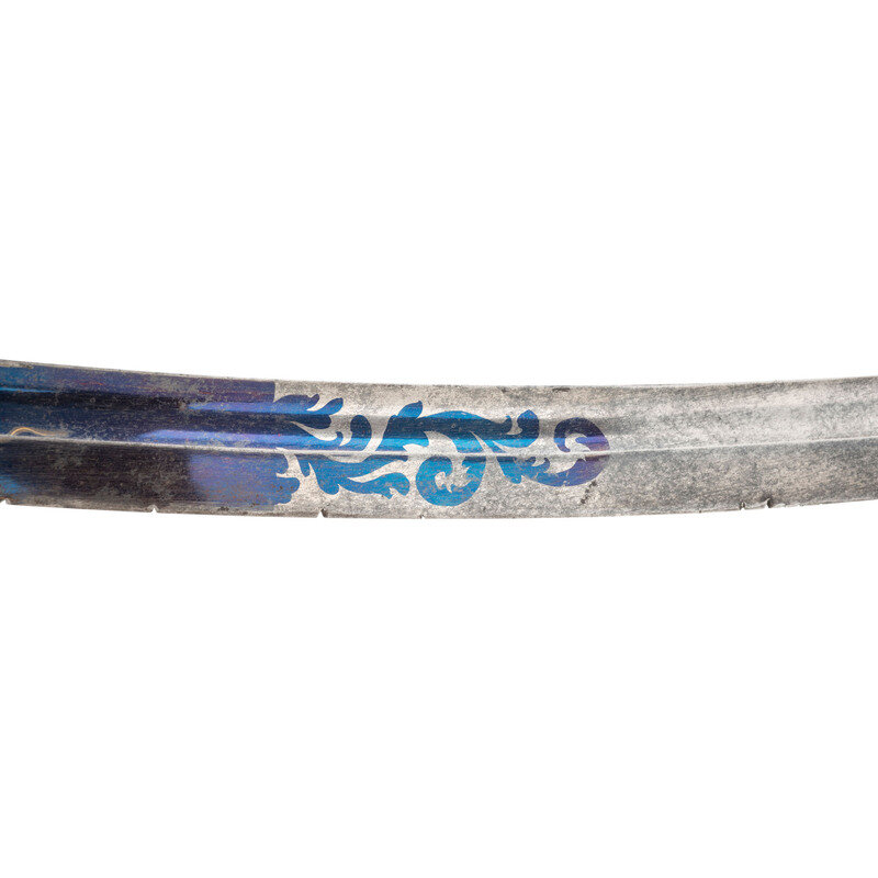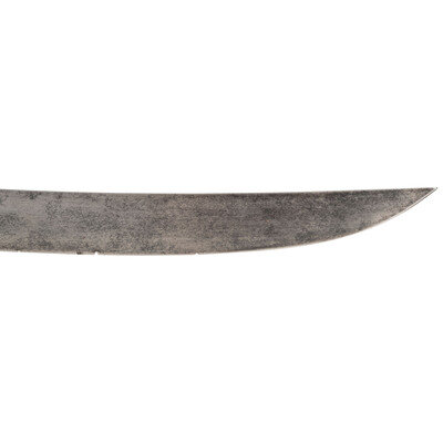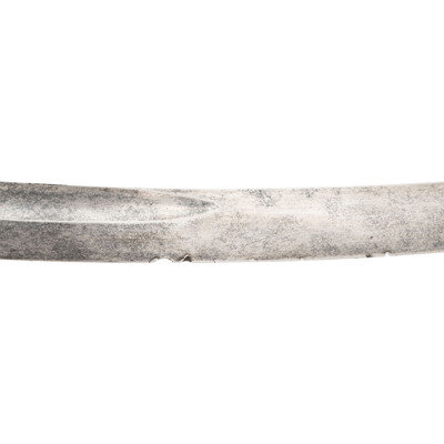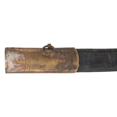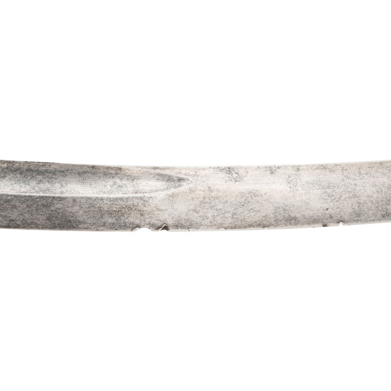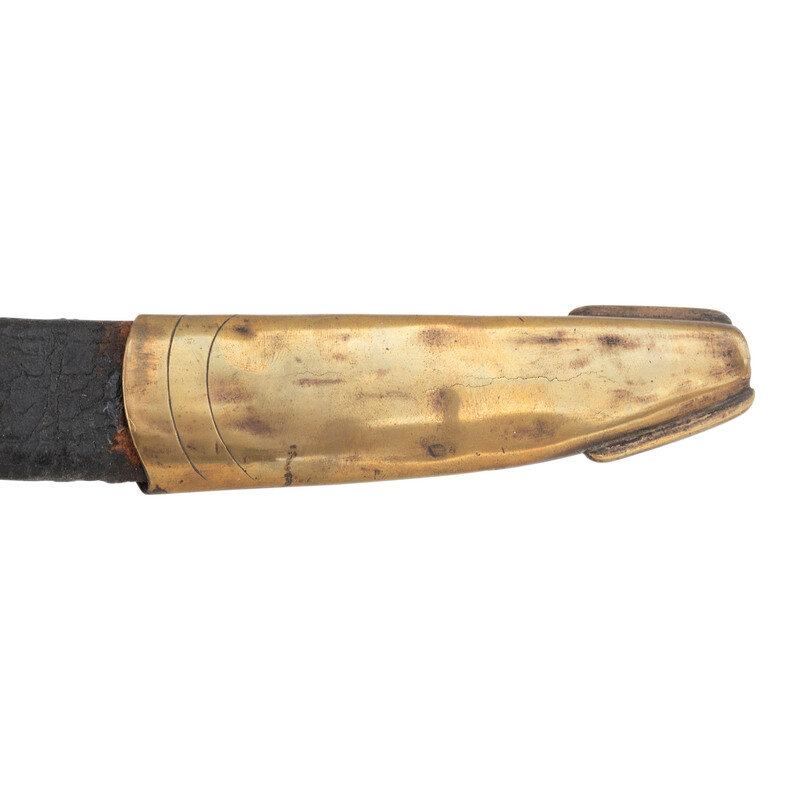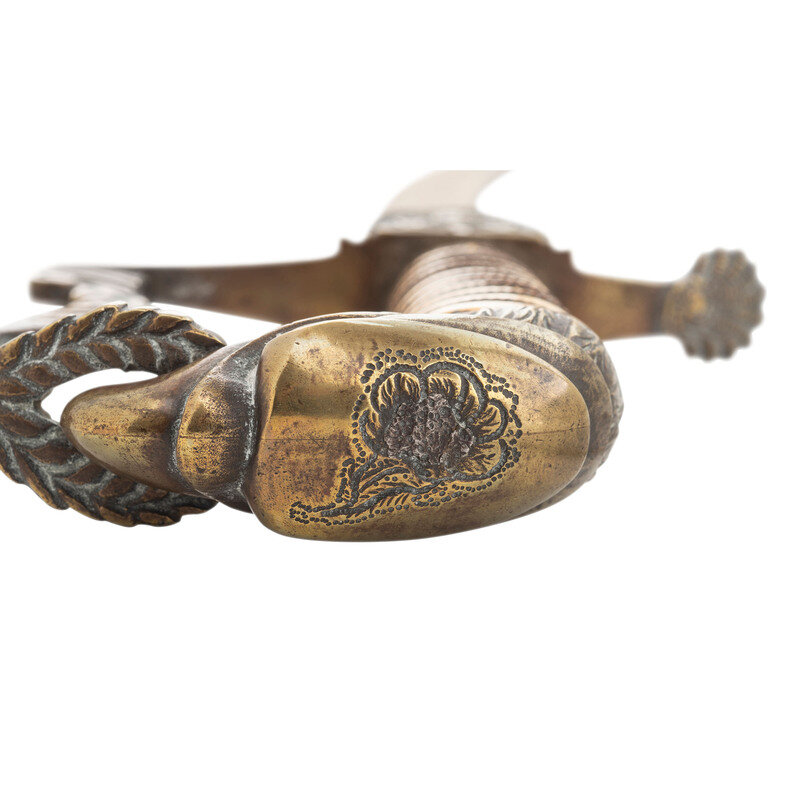 3" curved, singled edged-blade with 21.5" stopped median fuller. Blade 1.2" wide at ricasso. Overall length 35". 5.25" Eagle Head hilt with rococo reverse-P knuckle bow, shell motif quillon and Eagle motif shield shaped langets. Grooved bone grip with 11 wraps of twisted wire. Blued and gilt blade decorated with floral, martial and patriotic motifs. The sword is accompanied by a silvered brass mounted leather scabbard. Likely 1st quarter of the 19th century.