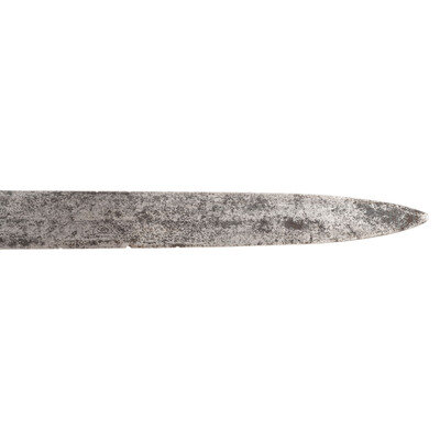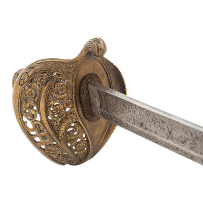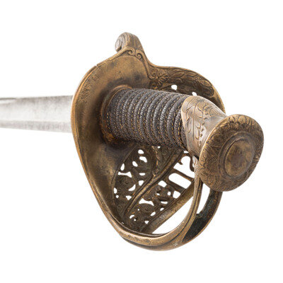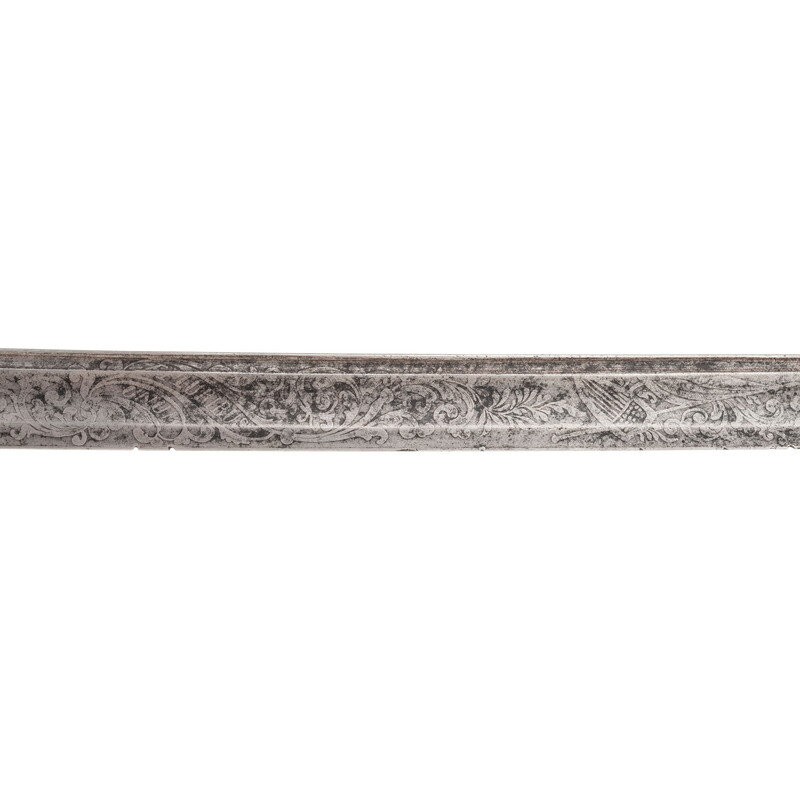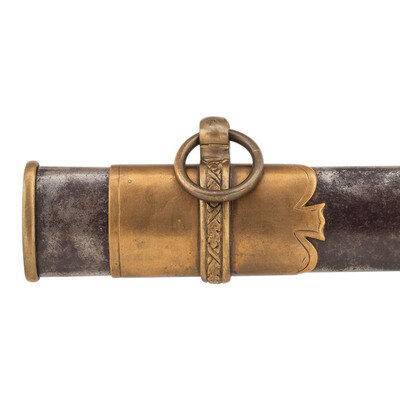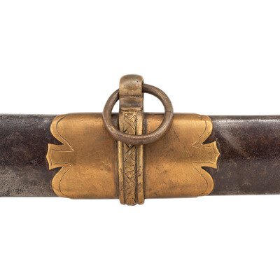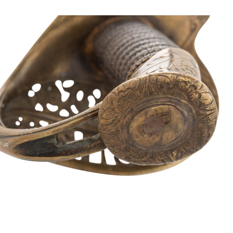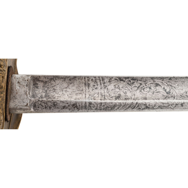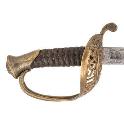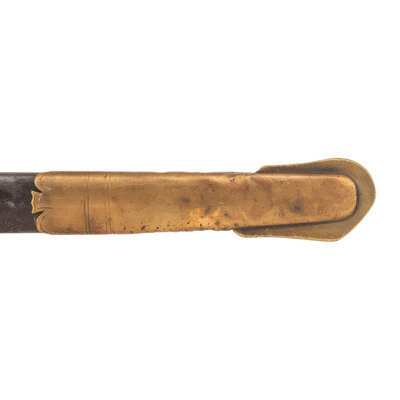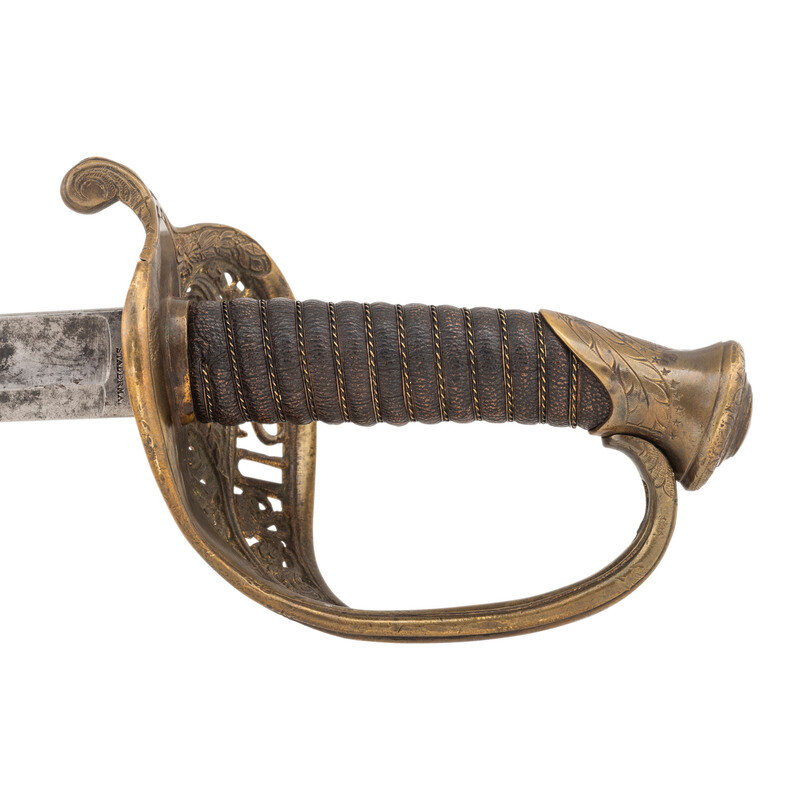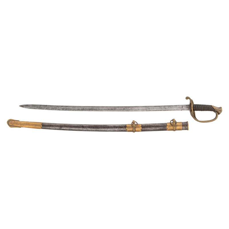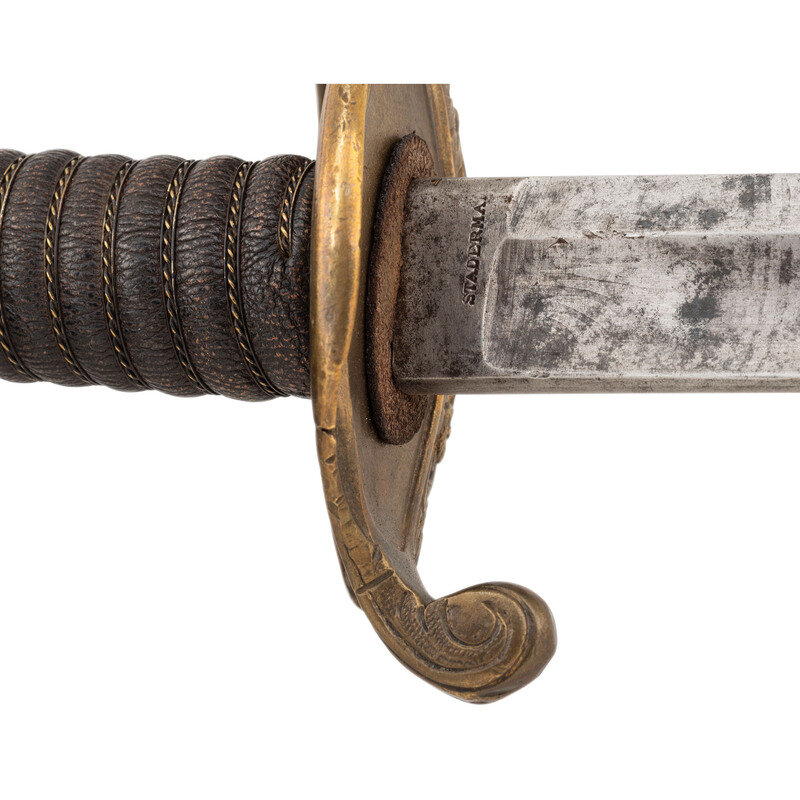 30.75" single edged spear point blade with 22" stopped median fuller, 1" wide at ricasso. Overall length 36.5". 5.75" cast brass hilt with US in the face of the guard and a grooved wooden grip covered in leather and with 13 wraps of multi-strand wire. Reverse ricasso stamped STADERMAN. Blade etched with foliate, martial and patriotic themes. The sword is accompanied by a browned steel scabbard with gilt brass mountings. John C. Staderman emigrated from Germany circa 1848 and established a business dealing in and making "gimps & fringes" in New York City. Circa 1863 he added military gods and furnishings to his wares and was listed as being "importers and manufacturers of military goods, including swords, sashes, belts & shoulder straps, etc." (Bazelon & McGuinn) The firm went out of business in 1876 but apparently only dealt in military goods circa 1863-1865. An uncommon retailer mark to find on Civil War period officers sword.