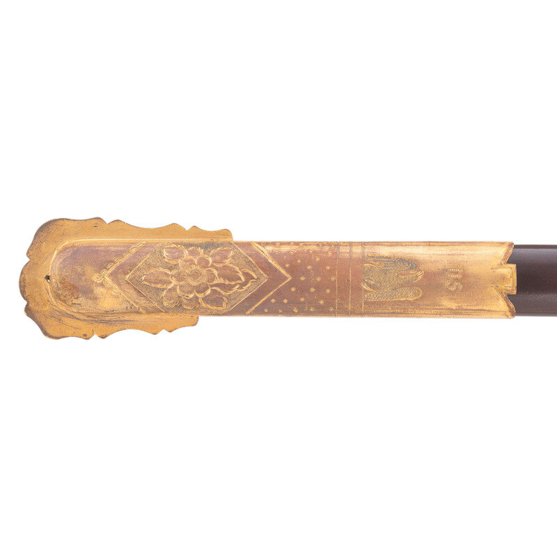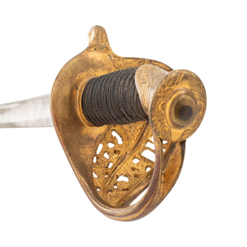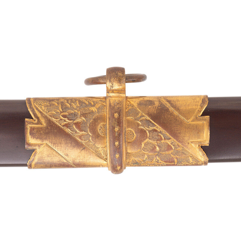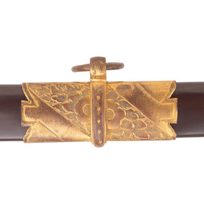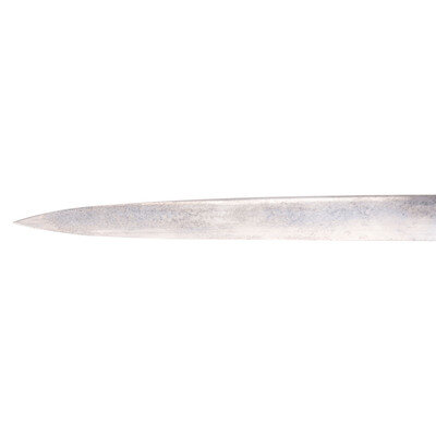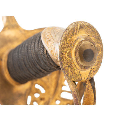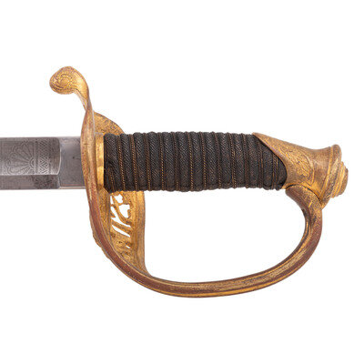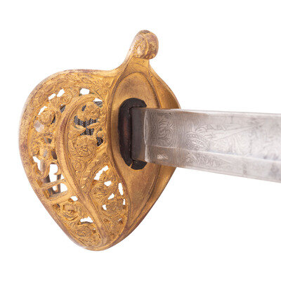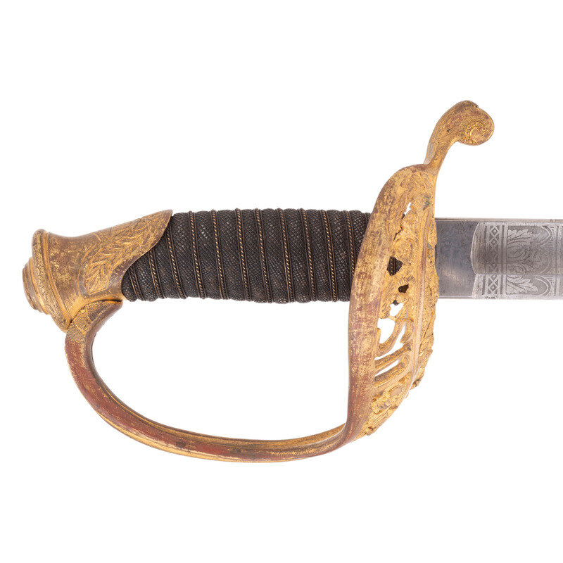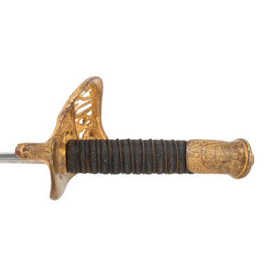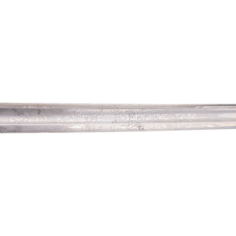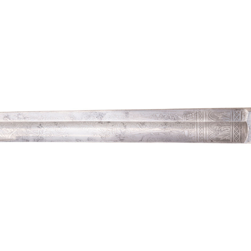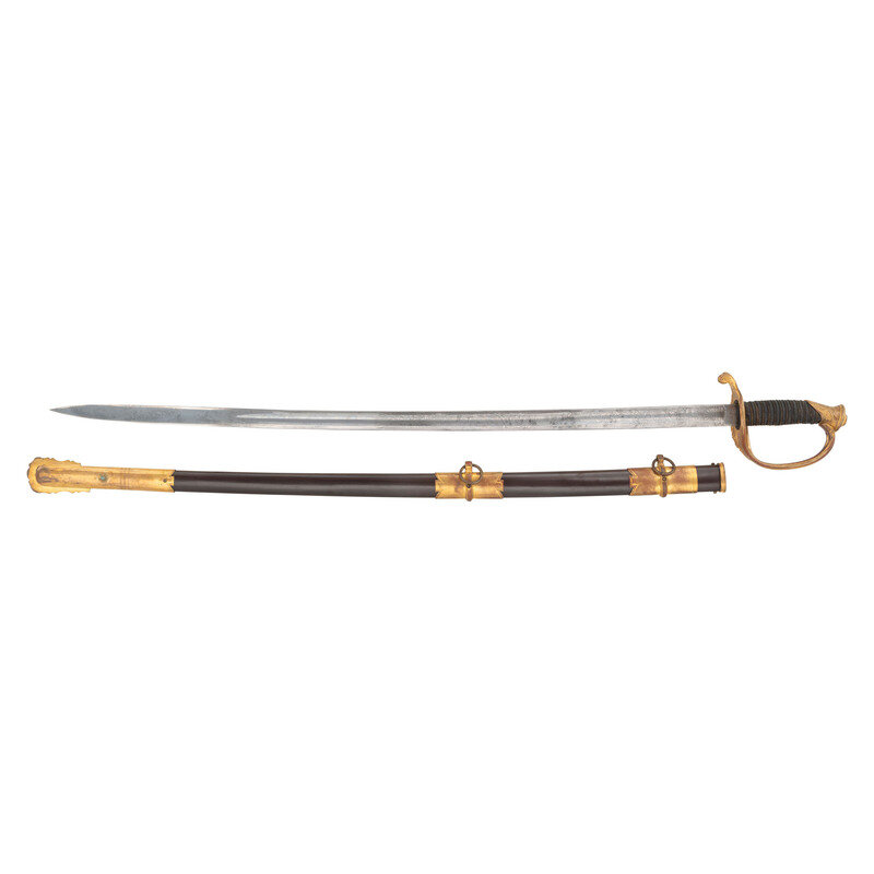 33.5" single edged spear point blade with 24" stopped median fuller. Blade 1.1" wide at ricasso. 39.25" in overall length with a 5.5" gilt cast brass hilt with US in the face of the guard. Grooved wood grip covered in shagreen with 13 wraps of multi-strand wire. Blade etched with floral, martial and patriotic motifs. Not marked as to maker, importer or retailer but the spine is etched IRON PROOF. The sword is accompanied by a browned steel scabbard with heavily chased gilt brass mounts.