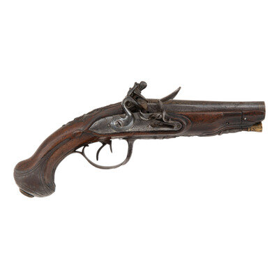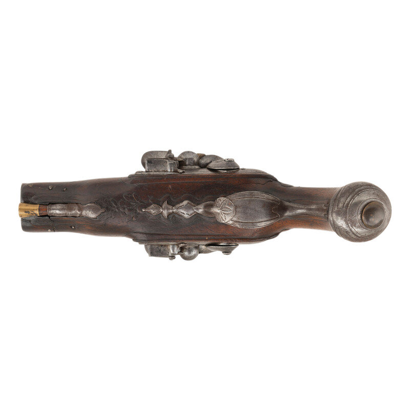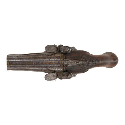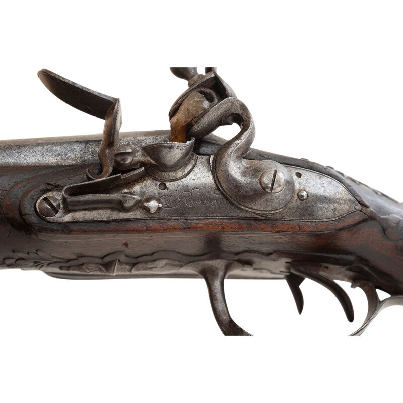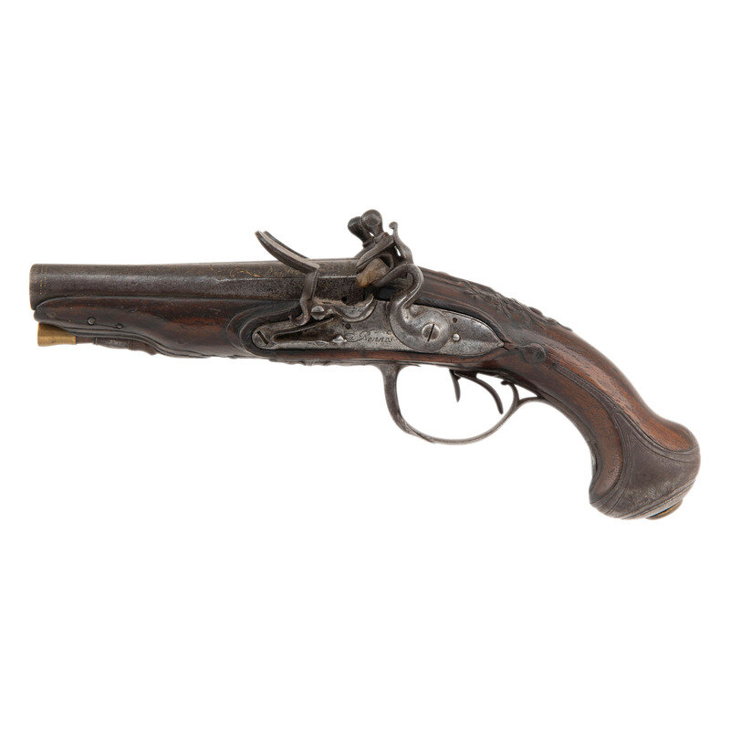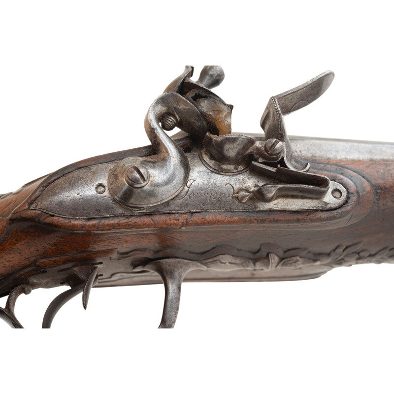 .48 caliber. 4.25" barrels. NSN. Browned barrels, bright locks, iron furniture, raised carved European hardwood stock. Double barrel smoothbore muzzleloading flintlock pistol with left and right locks, two triggers, a tang groove rear sight and no front sight. 3.125" convex locks with integral rounded, fenced and bridled steel pans and rounded swan neck cocks. Right lock is signed Jourjon in script with the left lock signed Rennes. Barrels decorated with engraved flowing foliate patterns highlighted with gilt inlays, stock with raised carved foliate patterns at the apron and forward of the triggerguard finial. Includes a broken brass tipped wood ramrod. According to Stockel, Rennes Jourjon worked circa 1770 in Ille-et-Vilaine, in the Brittany region of France. {ANTIQUE}