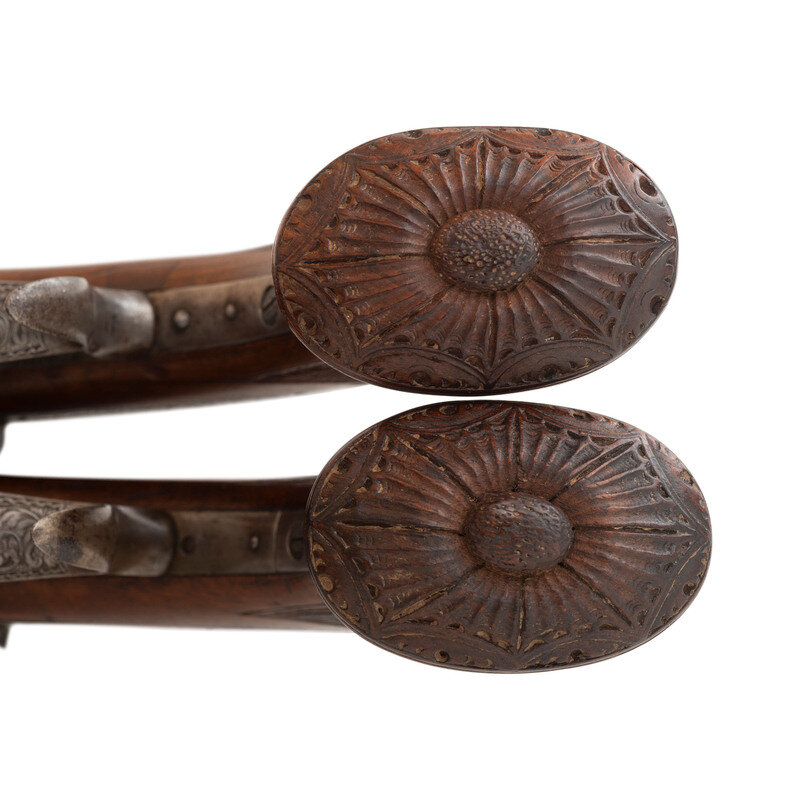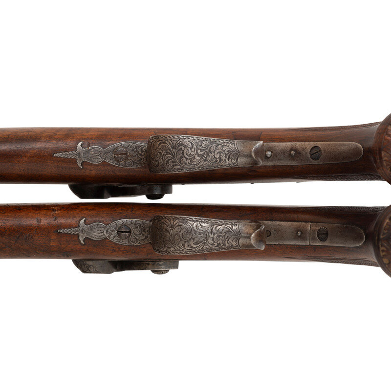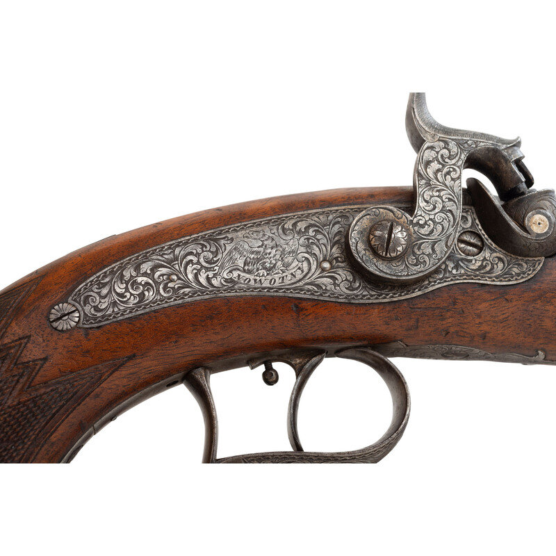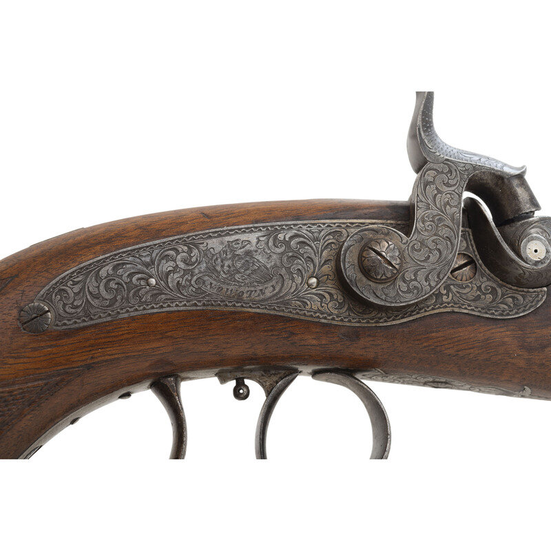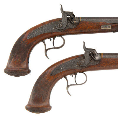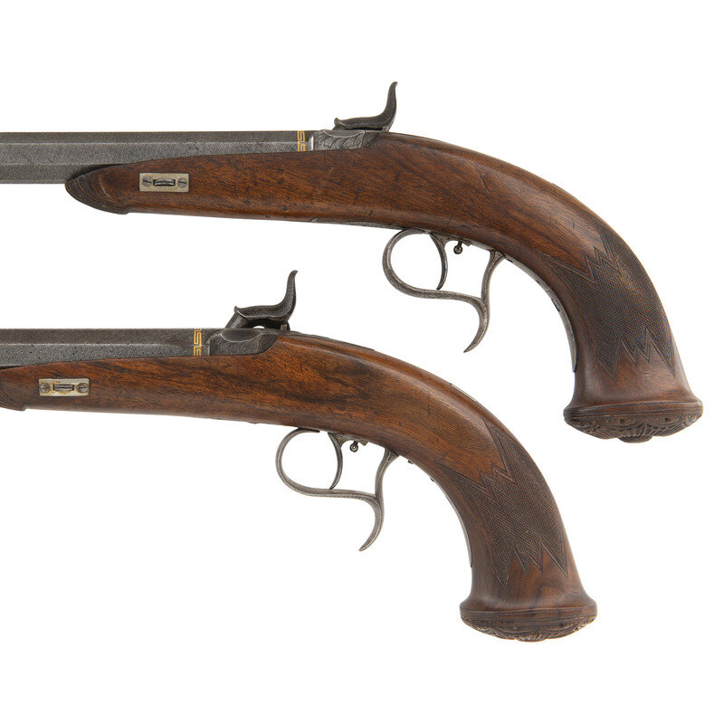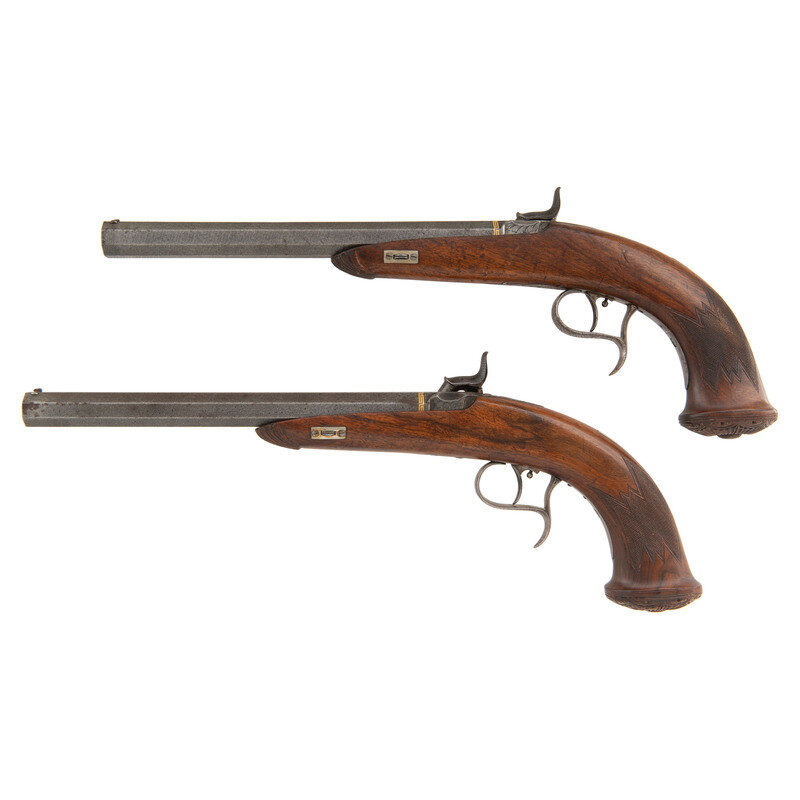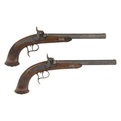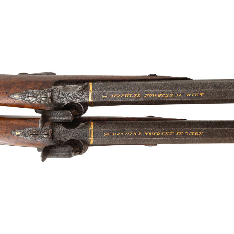 .45 caliber. 9.5" wedge retained octagonal barrels. NSN. Bright Damascus patterned barrels, iron furniture, checkered and raised carved European hardwood stocks. Single shot percussion muzzleloading target pistols with platinum blow out plugs, elevation adjustable rear sights, dovetailed front sights, adjustable single-set triggers and spur trigger guards. Barrels with complex Damascus patterning, gold bands at breeches and inlaid in gold on the top flats MATHIAS NOWONTNY IN WIEN. The pistols are numbered "1" and "2" on the barrels and the tangs. Deeply engraved back action percussion locks with tightly flowing foliate scrolls and spread-winged eagles sitting on a banner that reads NOWONTY. Stocks with checkered grips and featuring raised carved butts and forend tips. Matthias Nowotny worked circa 1825-1856, initially in Leitmeritz, Bohemia (Czech Republic) and then in Vienna, Austria after moving there in 1838. He was a gun maker to the Royal Court of Austria and made high end presentation guns for the nobility and ranking members of the Austrian army. Nowotny had business relations with Johann Springer, and after Nowotny committed suicide in 1856, his wife sold the business to Springer and Springer married Nowotny's sister. (Stockel) {ANTIQUE}