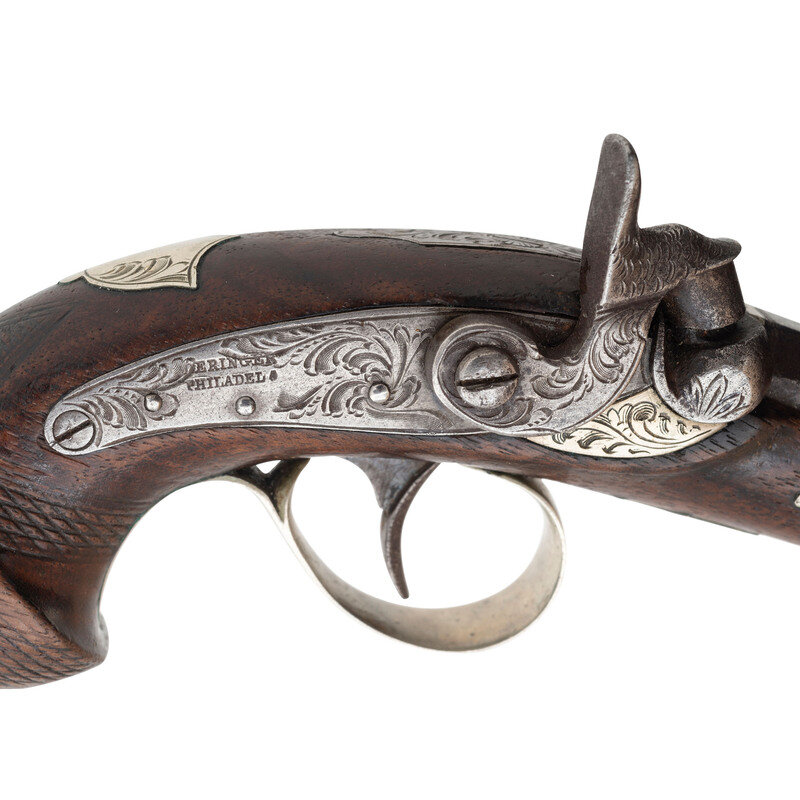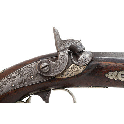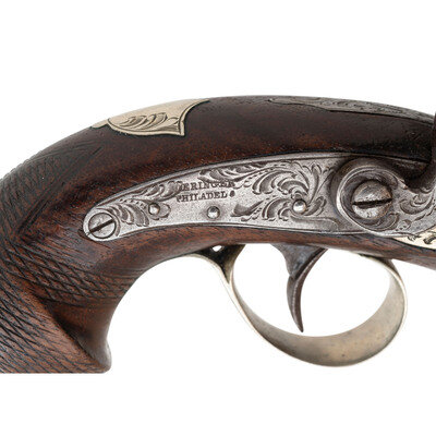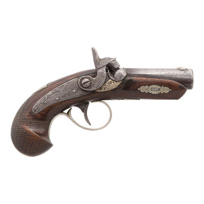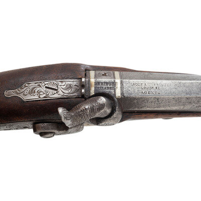 .40 caliber. 2.75" wedge-retained barrel. NSN. Browned finish, German silver mountings, checkered walnut stock. Single shot percussion muzzleloading pocket pistol. Back action percussion lock is lightly engraved with flowing foliate themes and marked DERINGER/PHILADELA in two lines. Breech with two-line Deringer mark and P proof in a sunburst. Top of barrel flat with rare, three-line WOLF & DURRINGER/LOUISE, KY/AGENTS marking. Lightly engraved German silver mountings, triggerguard with pineapple finial, shield shaped German silver thumb piece.