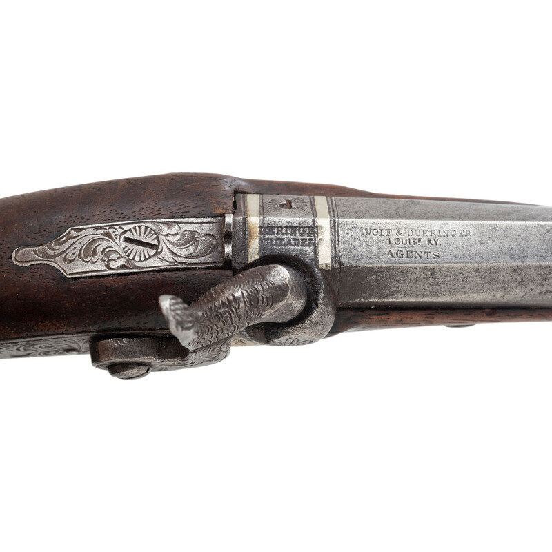 Wolf & Durrigner operated in Louisville, KY circa 1859-1871 as a Jewelry, Watch-maker, Fancy Goods and Firearms retailer. Wolf was the son of a silversmith who established himself in the city circa 1837. In addition to offering Deringer pistols for sale, the company sold Colt, Smith & Wesson, Allen & Wheelock, Sharps, Moore's and Bacon firearms as well as cartridges and ammunition for all of firearms of the period. A rare and desirable pistol with a Civil War era "Border State" retailer mark. {ANTIQUE}