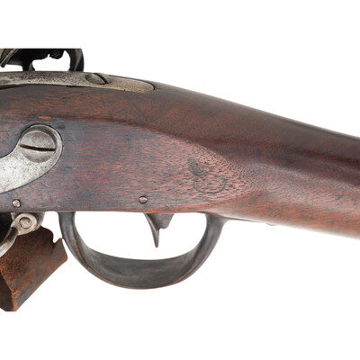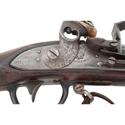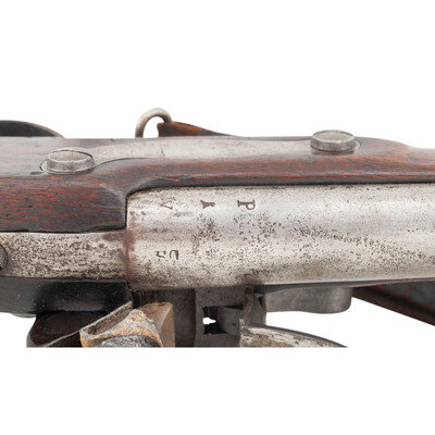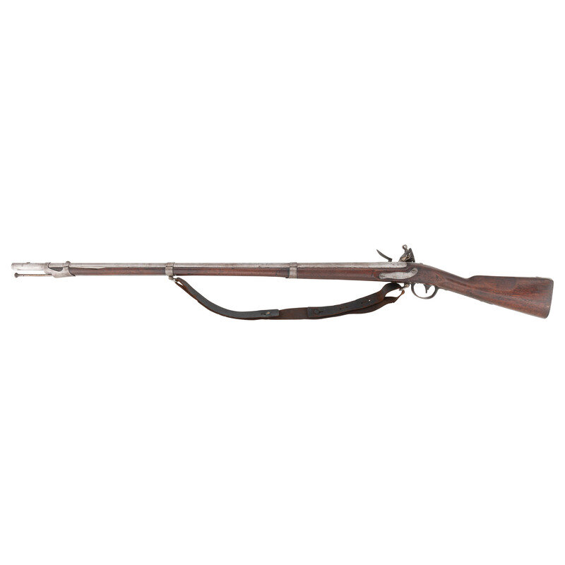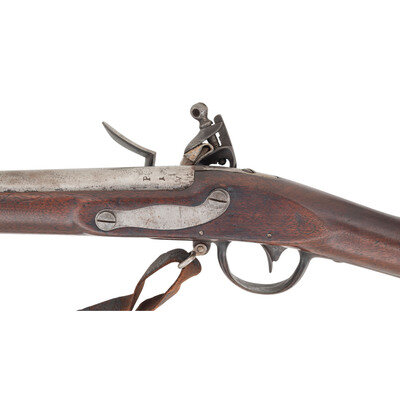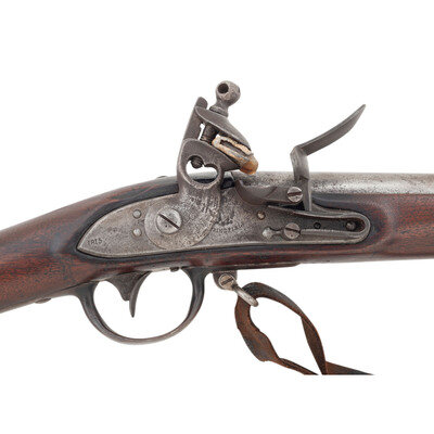 .69 caliber. 41.75" barrel. NSN. Bright finish, iron furniture, full length walnut musket stock with recessed cheek rest in reveres butt. Single shot smoothbore muzzleloading flintlock musket with three flat barrel bands secured by Wickham's improvement spring studs, screw retained sling swivels and a button head ramrod. Flat beveled flintlock with integral iron pan remains in original flint with matching punch dot marks on the lock components. Lock with standard US/{Spread-Winged Eagle}/SPRINGFIELD in an upward arc markings forward of the cock and dated 1815 vertically at the tail. Breech with P/{Eagle Head}/V inspection marks and buttplate tang dated 1816. Stock with what appears to be a weak script LS cartouche at the rear. A scarce example of one of the transitional model US military flintlock muskets before the standardization of the Model 1816. Wickham's studs were not used for very long on muskets and a scarce feature for the advanced US martial long arms collector. Includes an unrelated leather sling. {ANTIQUE}