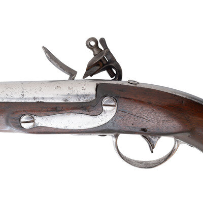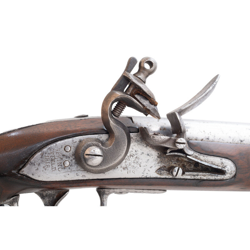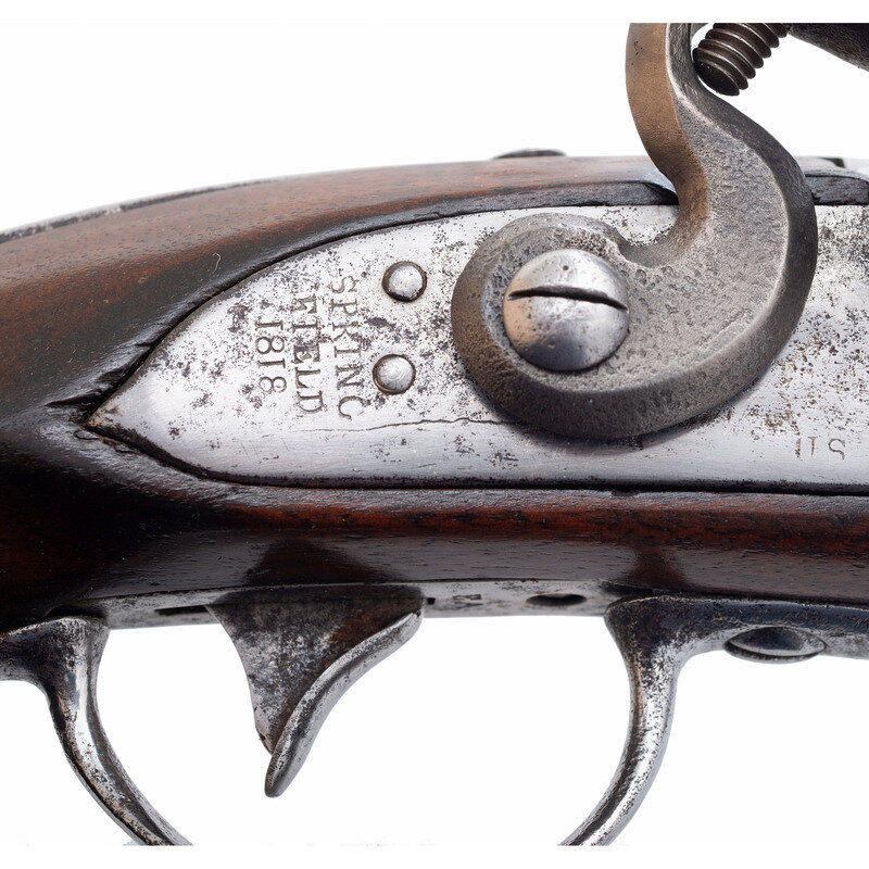 .69 caliber. 9" round barrel. NSN. Bright finish, iron furniture, walnut stock. Single shot smoothbore muzzleloading flintlock military pistol with the barrel secured by a single double-strapped band retained by a Wickham stud. 5.125" flat flint lock with pronounced teat at tail is marked SPRING/FIELD/1818 in three vertical lines at the tail and with weak traces of an {Eagle}/US forward of the cock. Lock incorporates an integral fenced and bridled rounded iron pan, frizzen with curved toe, frizzen spring with spear point finial and a flat faceted swan neck cock. The lock remains in original flint, although the mainspring is replaced, as is the top jaw screw and possibly the top jaw. The cock itself may be an old replacement as well but appears to be of the correct form. Top of breech dated 1818, matching the lock. Breech with a raised P in a depressed oval, {Eagle Head} and V proof and inspection marks. A replacement wooden ramrod is present in the channel under the stock.
