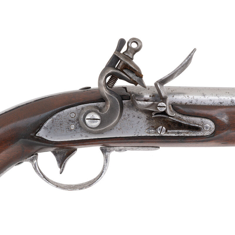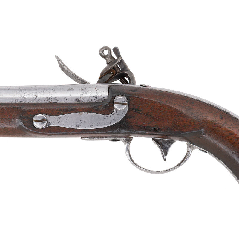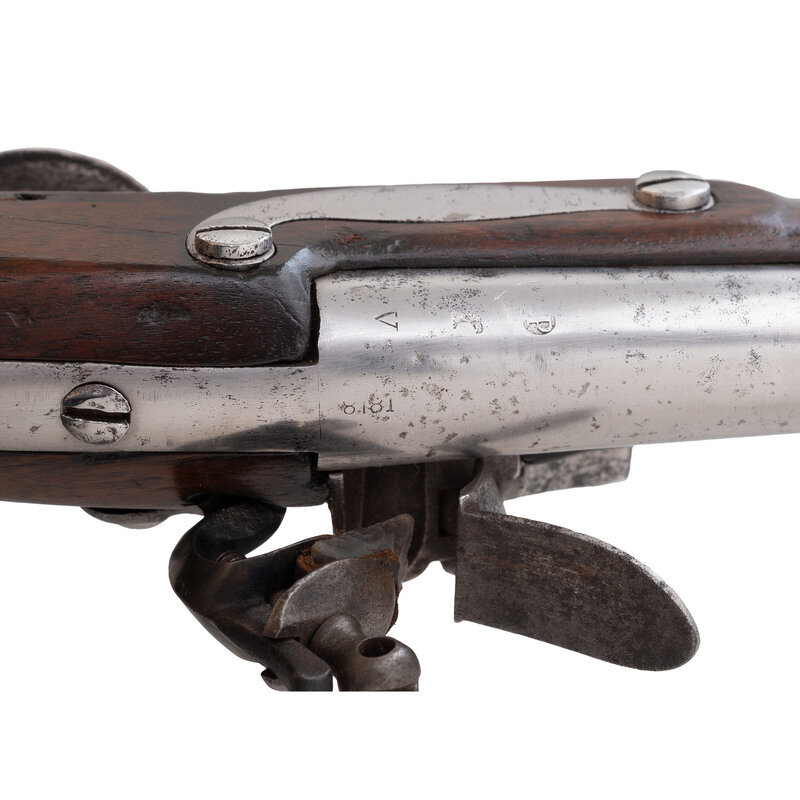 The US Model 1817 (aka 1807) pistol has an interesting history in that its initial production circa 1807-1808 was halted after only a few hundred at most were made, as the large caliber was simply uncontrollable and created severe recoil. When the project was returned to circa 1814-1815 it seems the production was more intent upon using up the parts already produced or possibly to keep the workmen at Springfield gainfully employed as the post-War of 1812 period meant that huge supplies of muskets were readily available after the downsizing of the army at the end of the war. It is unclear if these guns saw service with mounted troops on a state level, as there was no Federal cavalry at this time, or with other forces in need of pistols, like the navy. The pistol is important in the collection of Springfield Armory weapons in that it was the first pistol produced in any quantity at Springfield and would be one of only three produced in significant numbers, with the US M1855 Pistol Carbine and the M1911 being the other other two. An essential and difficult gun to acquire for the US martial pistol collector. {ANTIQUE}