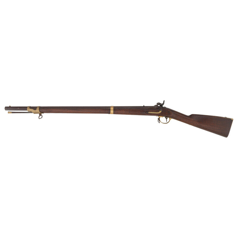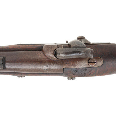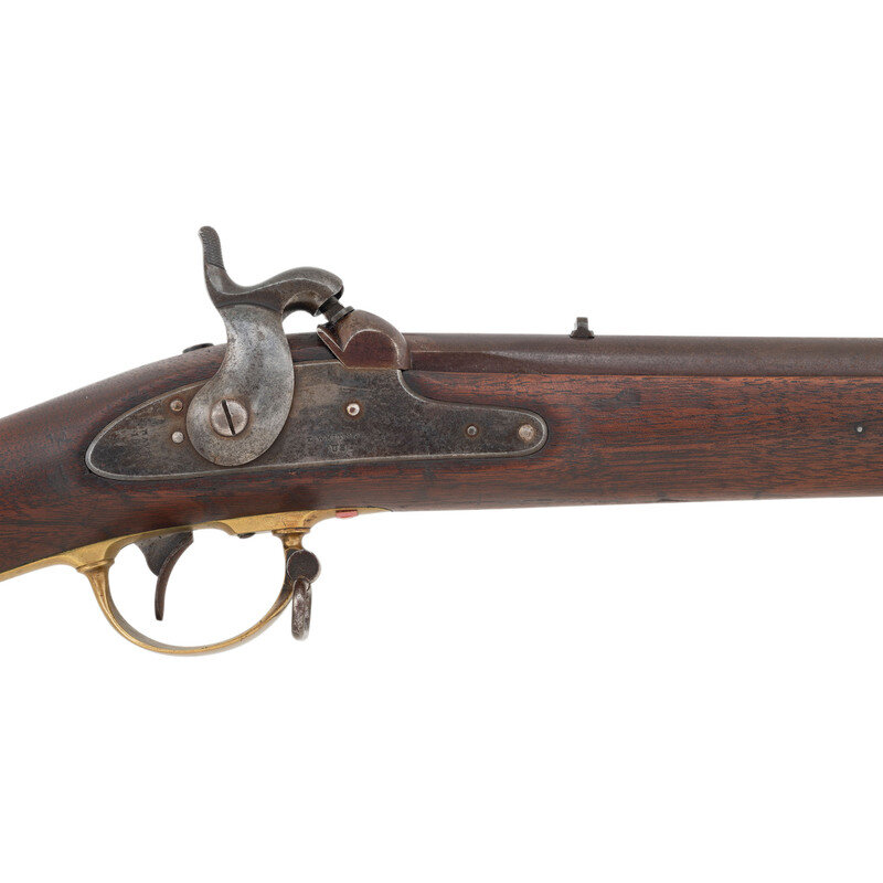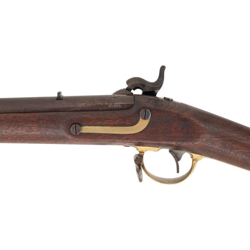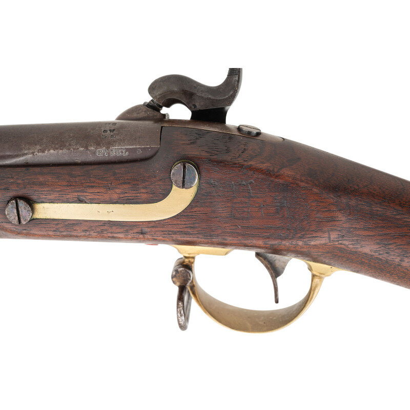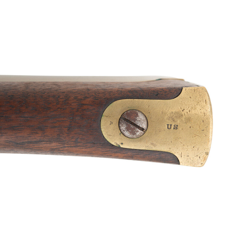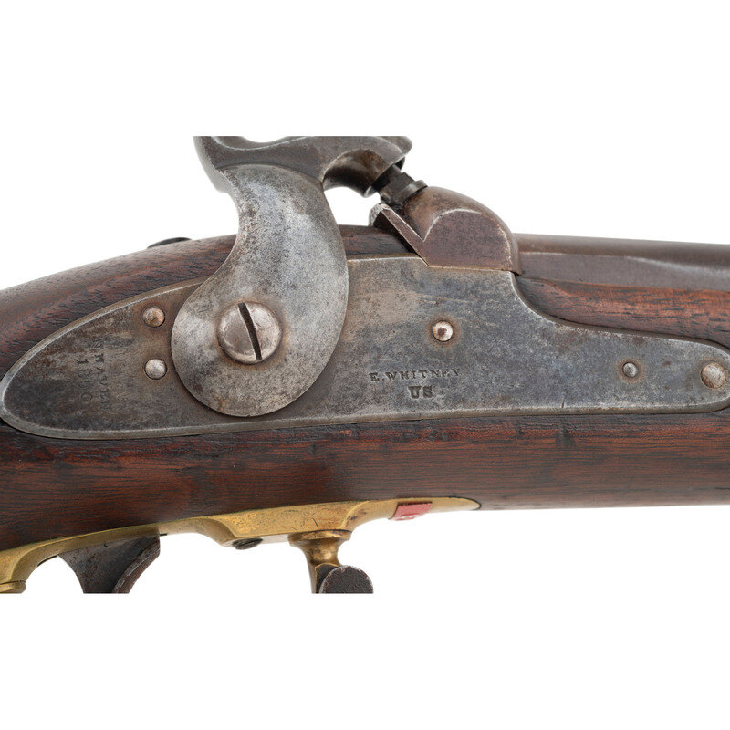 .54 caliber. 33" barrel. NSN. Browned finish, color casehardened lock and hammer, brass furniture, walnut stock. Single shot percussion muzzleloading rifle with fixed rear sight, brass blade front sight, brass patchbox, sling swivels and brass tipped trumpet head ramrod. Lock marked U.S./E. WHITNEY forward of hammer and N. HAVEN/1850 vertically at the tail. Breech with US/GW/V P markings and dated 1851 on the tang. Left barrel flat stamped STEEL. No cartouches visible on stock. {ANTIQUE}