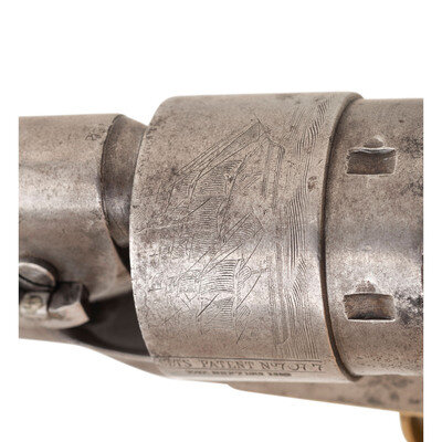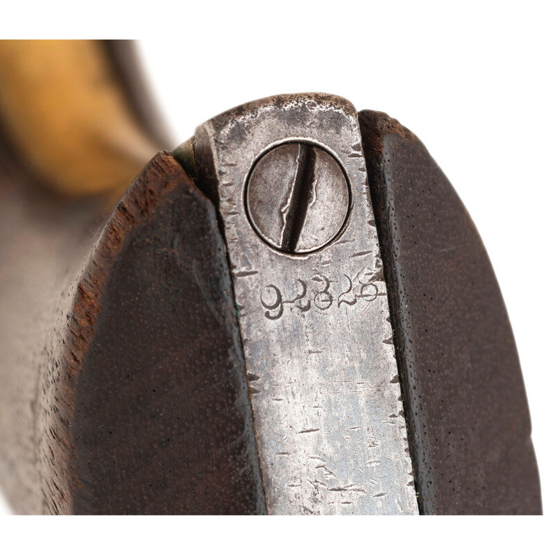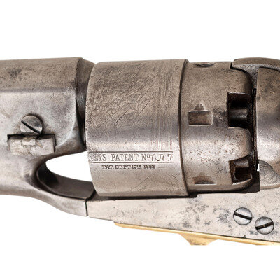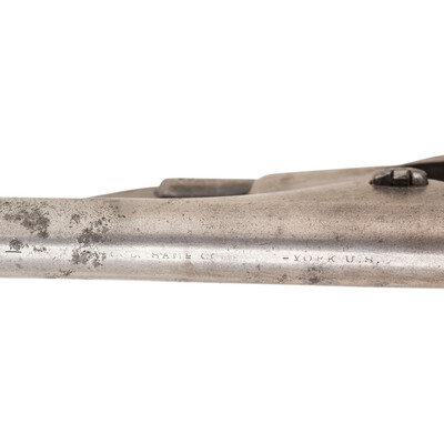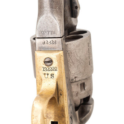 According to research in The Colt Model 1860 Army Revolver by Charles W. Pate we know that by May of 1867, the Ordnance Department reported only 1,611 “serviceable” Colt Army revolvers available for issue, with an additional 5,454 in inventory that needed repairs. As the supply of available Colt Army revolvers in the various arsenals and depots was so severely depleted, a significant program of “cleaning and repairing” (C&R) was undertaken to place revolvers back into service. This was a multi-faceted approach that refurbished the guns to make them functional and often included refinishing as well. In many cases the arms were reassembled using salvaged parts from other guns, which resulted in mixed number revolvers. Within the group of refurbished, “cleaned & repaired” Colt Army revolvers is a smaller sub-set of revolvers that is estimated to include between 1,000 and 1,500 guns that were marked US on their triggerguard plates, forward of the triggerguard bow. This mark is in addition to the guns showing the usual indications of an arsenal rebuild. Mr. Pate has undertaken a major analysis of some 118 known, surviving examples of these special M1860 Army revolvers and has made some interesting discoveries and drawn some interesting conclusions about these guns. For years, collectors have referred to these guns as having been rebuilt at the Springfield Arsenal. However, his research in the arsenal records has determined this not to be the case. Rather, based upon his findings, the guns were rebuilt either at the St. Louis Arsenal or in Leavenworth, although St. Louis appears to be the most likely location. Mr. Pate believes that all of the “US” marked examples were rebuilt during the same period of a few months circa 1867-1869 at one of these facilities and has determined that a number of specific features are common to the guns. All bear the US mark on the triggerguard, without “periods” between the letters. The guns usually show at least one mismatched part, often several, but the theory that no regard to matching numbers during the reassembly of the guns is not completely true, as most show matching groups of parts. The guns typically show signs of having been refinished, with weak markings, polishing marks, particularly a line on the right side of the frame above the hammer screw, as well other indicators of being refinished, even though the guns usually show heavy wear and use after they were rebuilt and rarely retain any finish at all. The guns almost all have barrels that are slightly short of full-length, typically between .125” and .25” shorter than when new. Grips often fit poorly, no doubt due to being salvaged from other guns, thus not matching the grip frame contours of the gun they have been added to. Mr. Pate was able to verify the theory that many of these guns were subsequently issued to the 10th US Cavalry, the legendary “Buffalo Soldier” cavalry regiments. A rare and desirable revolver from the Indian Wars period.