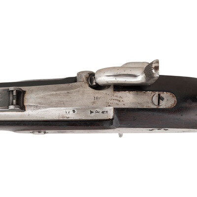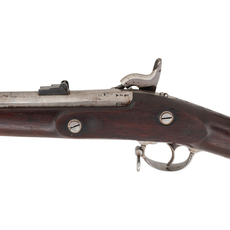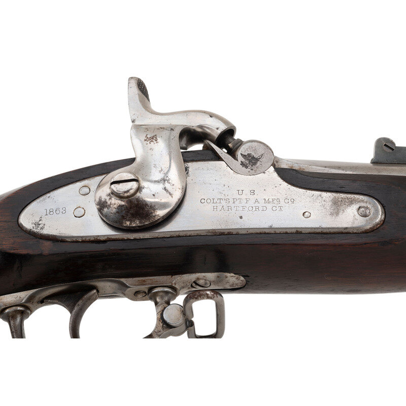 .58 caliber. 40" barrel secured by three rounded clamping bands. NSN. Bright finish, iron furniture, full length walnut musket stock. Single shot percussion muzzleloading rifle musket with 1861 pattern three leaf rear sight, combination front sight and socket bayonet lug and sling swivels on the triggerguard bow and middle barrel band. Standard Colt lock markings, dated 1863 at tail. Breech dated 1863 as well and left flat with V/P/{Eagle Head} inspection marks as well as M 3 and STEEL markings. Counterpane with clear script MTH cartouche at tail. {ANTIQUE}