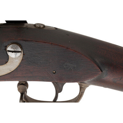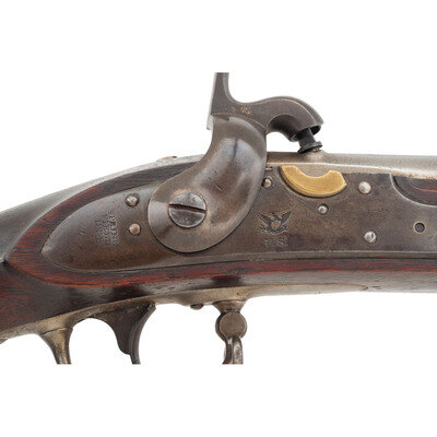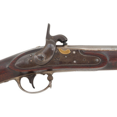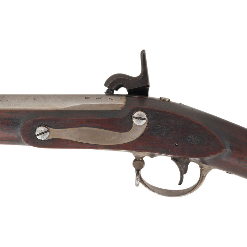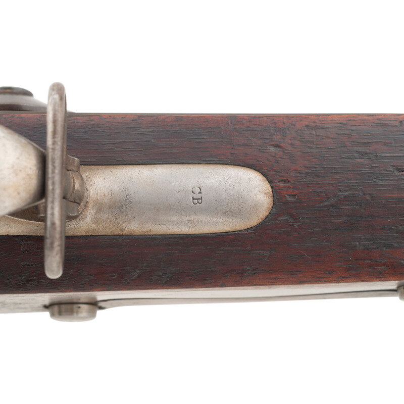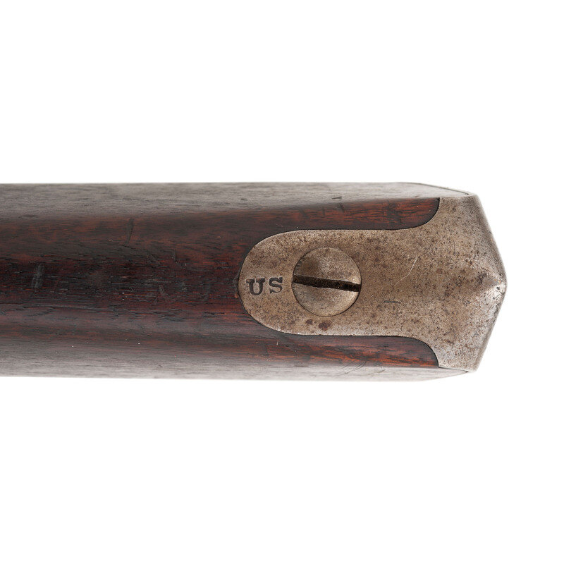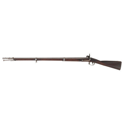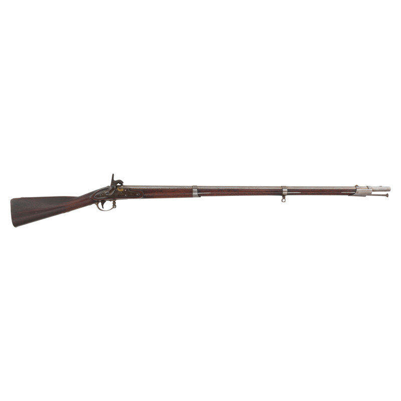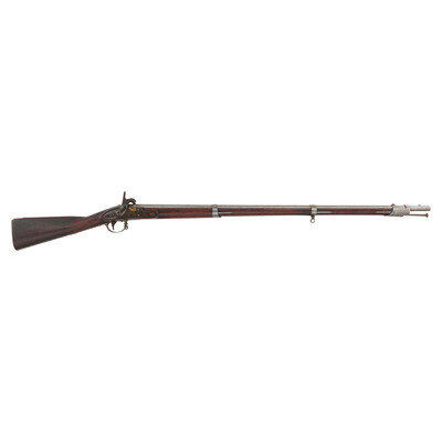 .69 caliber. 42" barrel. NSN. Bright finish, color casehardened lock, full length walnut musket stock. Single shot percussion altered smoothbore musket with brass blade front sight, no rear sight, sling swivels and full-length button head ramrod. Lock with standard Springfield markings, dated 1839 at the tail, barrel with standard proofs and dated 1839 at the tang. Counterpane with two crisp script cartouches, the JM of Justin Murphy and the TW of Springfield Master Armor Thomas Warner. {ANTIQUE}
