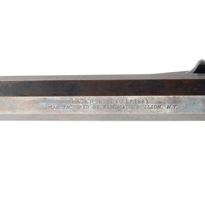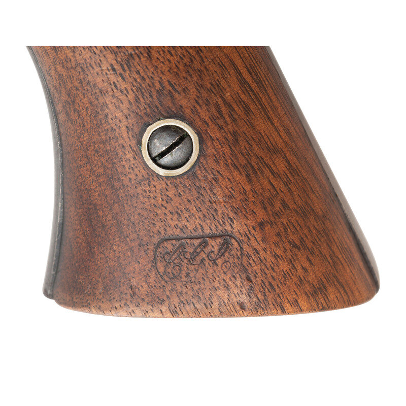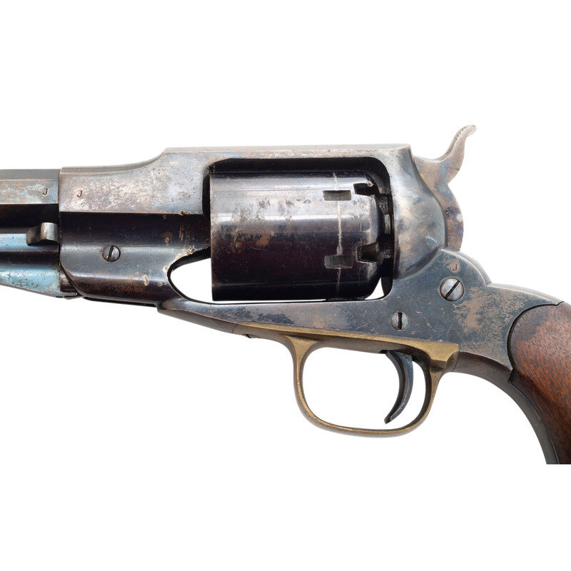 .36 caliber. 7.375" octagonal barrel. SN: 16003. Blued finish, color casehardened hammer, brass triggerguard, smooth two-piece walnut grips. Single action percussion revolver with solid frame, unfluted six-chambered cylinder without safety notches at the rear, high spur hammer, German silver cone front sight and unmodified Elliot's patent loading lever groove. Two-line barre address with Elliot patent date. "J" sub-inspections on many of the metal parts, a partial script CGC cartouche is present on the left grip. Left grip is pencil numbered to the gun, cylinder is numbered on the rear face but the numbers are not legible. A very nice martial Remington Navy revolver. {ANTIQUE}