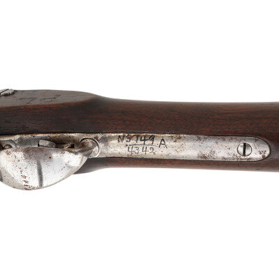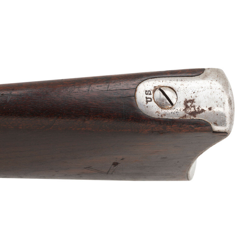 .58RF. 37.5" barrel secured by three flat spring retained barrel bands. NSN. Bright finish, steel furniture, full length walnut musket stock. Single shot breechloading alteration of a Civil War musket with Springfield with "Trapdoor" action, 1864 pattern leaf rear sight, combination front sight and socket bayonet lug, sling swivels on triggerguard bow and middle barrel band and straight shank tulip head ramrod. 1865 dated altered Springfield musket lock, no visible cartouches, old museum style inventory number in ink on triggerguard plate. {ANTIQUE}