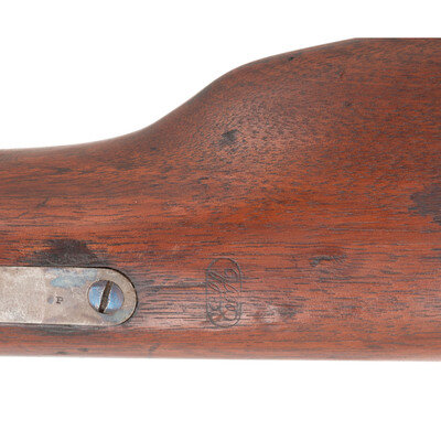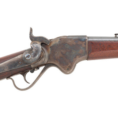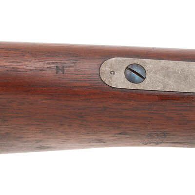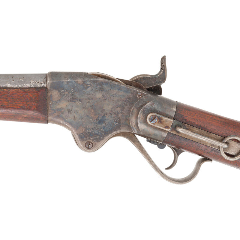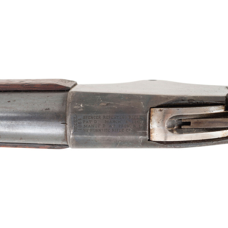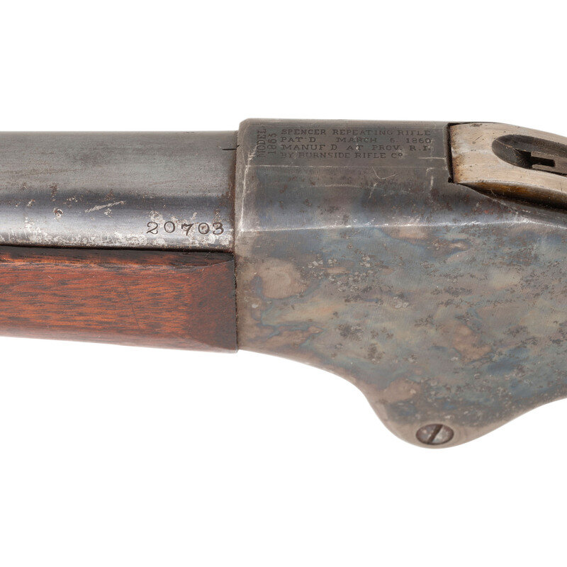 .50RF. 32.5" barrel. SN: 20703. Blued and color casehardened finish, walnut buttstock and forend secured by two solid, spring retained barrel bands. Lever action repeating rifle with butt magazine and follower, arsenal altered from carbine with Stabler cut-off, M1868 ladder rear sight, musket pattern combination front sight and socket bayonet lug, sling swivels on upper barrel band and in toe of stock, correct grooved base magazine tube follower in butt, single swelled shoulder jag-head cleaning rod. Standard Burnside Rifle Company M1865 markings on top of receiver, script ESA cartouche to rear of sling bar. Springfield barrel serial numbered to match the receiver. In 1871 the Springfield Armory assembled 1,108 Spencer Infantry Rifles from Burnside contract M1865 Spencer Carbines. During the process the guns had newly made Springfield barrels added to them and they were refinished. {ANTIQUE}