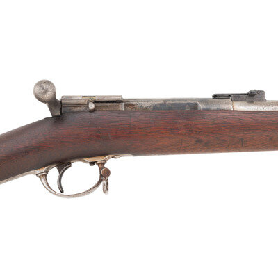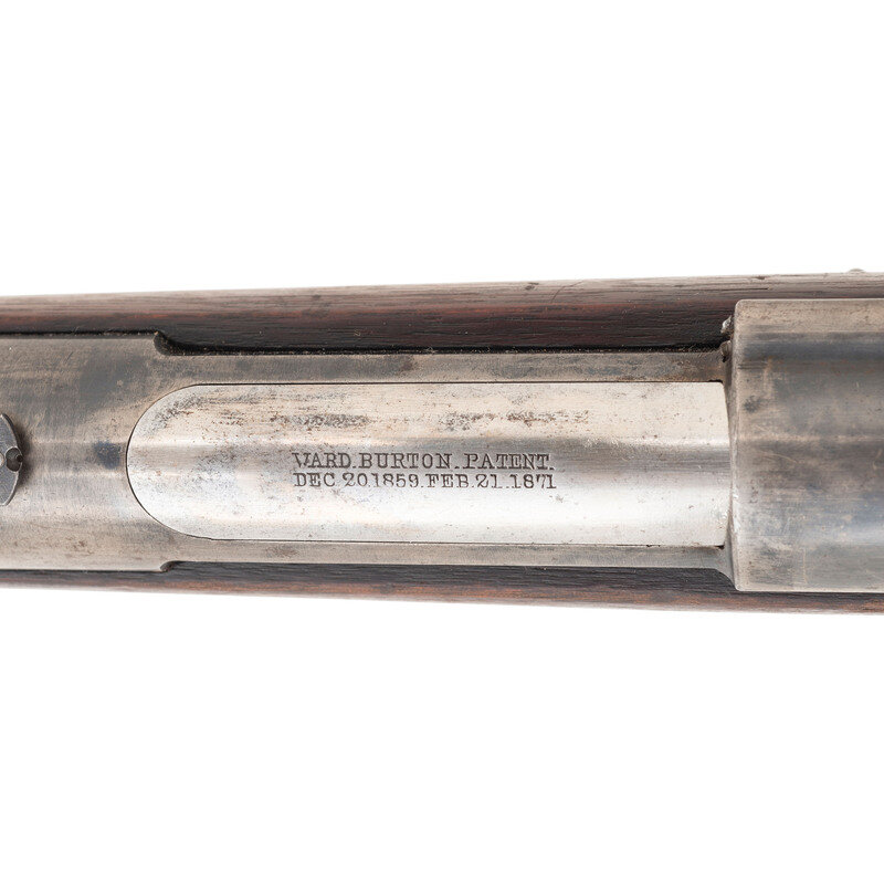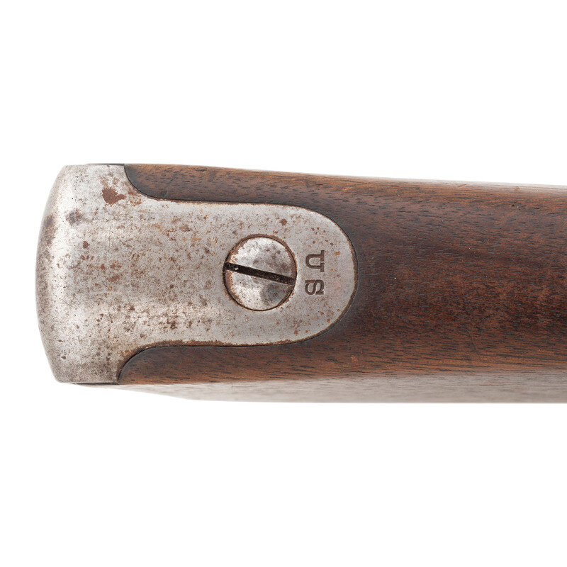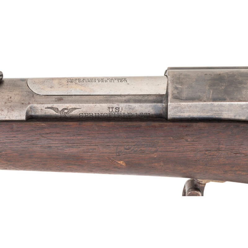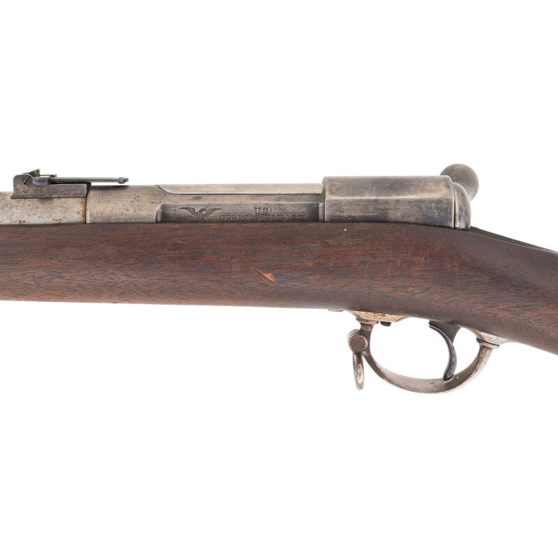 .50-70. 32.625" barrel. NSN. Bright barrel and furniture, case hardened receiver, full length walnut musket stock with two solid, spring-retained rounded barrel bands. Single shot bolt action, cock on closing with right side receiver safety, M1868 patten ladder rear sight, musket style combination front sight and socket bayonet lug, sling swivels on triggerguard bow and upper barrel band, single shoulder jag head cleaning rod. Standard receiver markings, two legible script cartouches including the JWK of John W Keene and the ESA of Erskine S Allin on the counterpane. Only 1,011 of these rifles were produced circa 1871 for field trials, along with 316 carbines. The cock on closing action with lack of a visible or tactile cocking indicator caused confusion, accidental discharges and an overall distrust of the design and the guns were withdrawn from service circa 1873 with the adoption of the M1873 Trapdoor rifle series. {ANTIQUE}